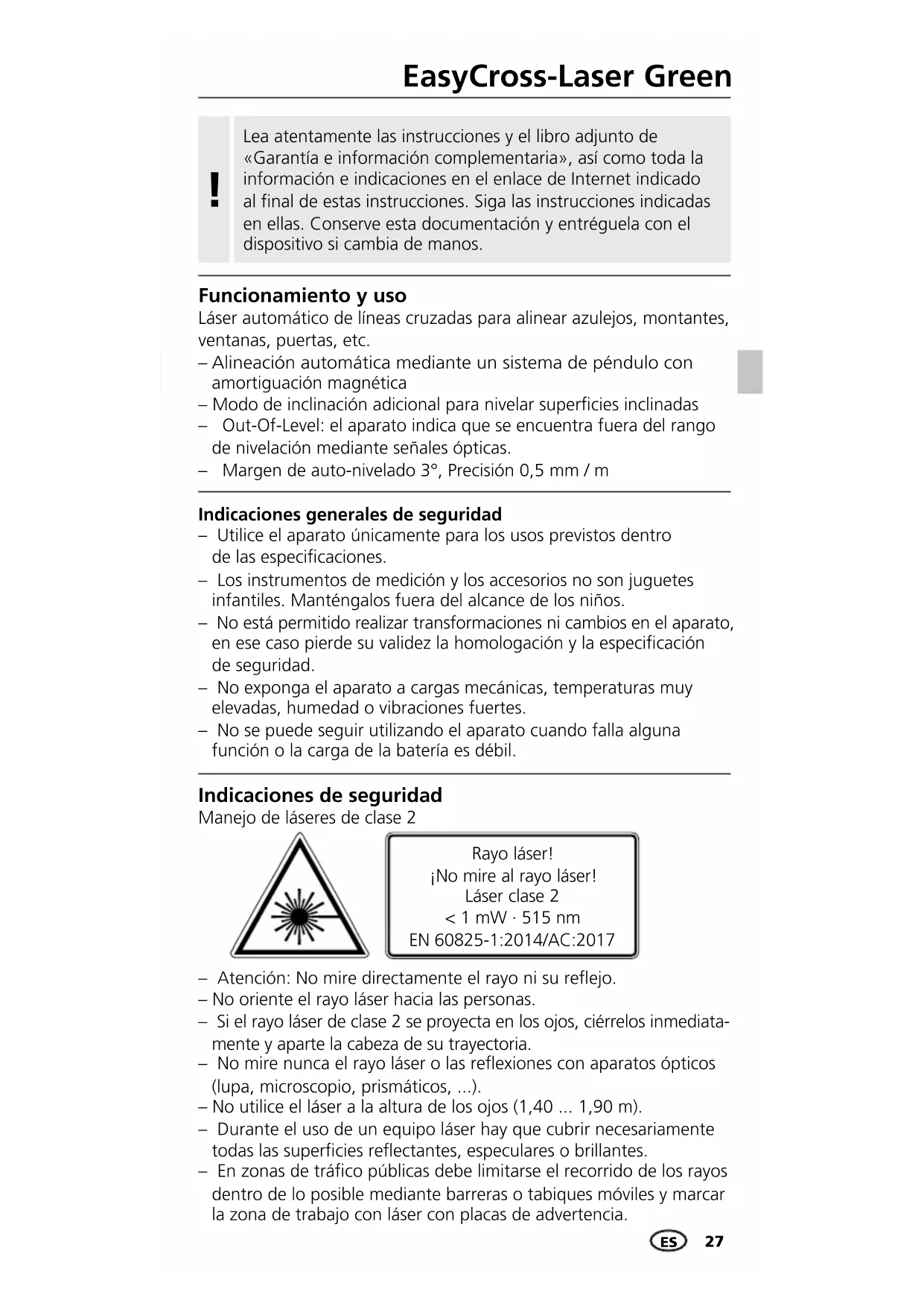 Alineación automática mediante un sistema de péndulo con amortiguación magnética – Modo de inclinación adicional para nivelar supercies inclinadas – Out-Of-Level: el aparato indica que se encuentra fuera del rango de nivelación mediante señales ópticas. – Margen de auto-nivelado 3°, Precisión 0,5 mm / m – Atención: No mire directamente el rayo ni su reejo. – No oriente el rayo láser hacia las personas. – Si el rayo láser de clase 2 se proyecta en los ojos, ciérrelos inmediata- mente y aparte la cabeza de su trayectoria. – No mire nunca el rayo láser o las reexiones con aparatos ópticos (lupa, microscopio, prismáticos, ...). – No utilice el láser a la altura de los ojos (1,40 ... 1,90 m). – Durante el uso de un equipo láser hay que cubrir necesariamente todas las supercies reectantes, especulares o brillantes. – En zonas de tráco públicas debe limitarse el recorrido de los rayos dentro de lo posible mediante barreras o tabiques móviles y marcar la zona de trabajo con láser con placas de advertencia. Rayo láser! ¡No mire al rayo láser! Láser clase 2 < 1 mW · 515 nm EN 60825-1:2014/AC:2017 Indicaciones de seguridad Manejo de láseres de clase 2 Indicaciones generales de seguridad – Utilice el aparato únicamente para los usos previstos dentro de las especicaciones. – Los instrumentos de medición y los accesorios no son juguetes infantiles. Manténgalos fuera del alcance de los niños. – No está permitido realizar transformaciones ni cambios en el aparato, en ese caso pierde su validez la homologación y la especicación de seguridad. – No exponga el aparato a cargas mecánicas, temperaturas muy elevadas, humedad o vibraciones fuertes. – No se puede seguir utilizando el aparato cuando falla alguna función o la carga de la batería es débil. Lea atentamente las instrucciones y el libro adjunto de «Garantía e información complementaria», así como toda la información e indicaciones en el enlace de Internet indicado al final de estas instrucciones. Siga las instrucciones indicadas en ellas. Conserve esta documentación y entréguela con el dispositivo si cambia de manos. !28 Para el transporte, apagar siempre todos los láseres, bloquear el péndulo y cambiar el interruptor deslizante (3) hacia la derecha.