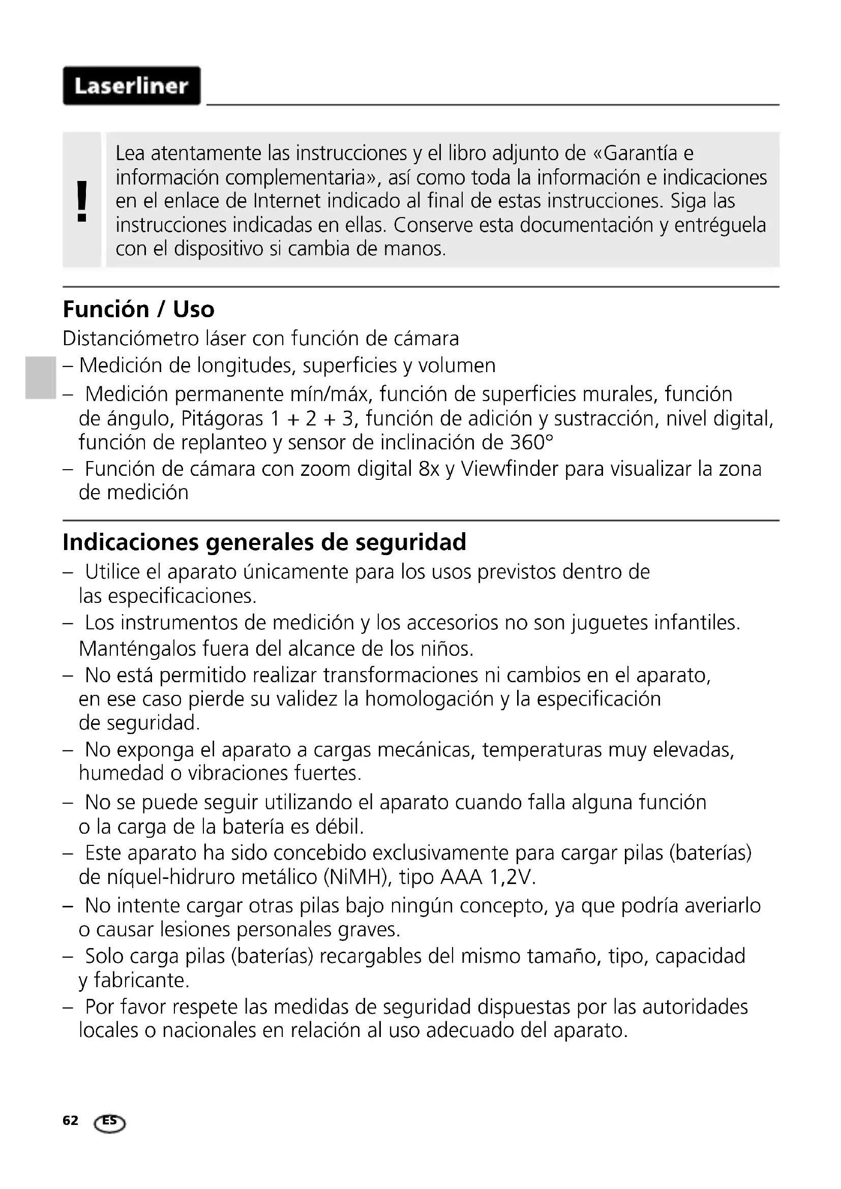 Instrucciones de seguridad Manejo de radiación electromagnética Poner las pilas recargables Abra el compartimento de baterías y coloque las baterías recargables (3 x NiMH, tipo AAA) respetando los símbolos de instalación. Coloque las pilas en el polo correcto. Las pilas recargables se pueden cargar en el aparato con el cable de carga adjunto. – El instrumento de medición cumple las normas y limitaciones de compatibilidad electromagnética según la Directiva 2014/30/UE de compatibilidad electromagnética (EMC). – Es necesario observar las limitaciones de uso locales, por ejemplo en hospitales, aviones, gasolineras o cerca de personas con marcapasos. Se pueden producir efectos peligrosos o interferencias sobre los dispositivos electrónicos o por causa de estos. – El uso cerca de altas tensiones o bajo campos electromagnéticos alternos elevados puede mermar la precisión de la medición. Instrucciones de seguridad Manejo de láseres de clase 2 Rayo láser! ¡No mire al rayo láser! Láser clase 2 < 1 mW · 635 nm EN 60825-1:2014 – Atención: No mire directamente el rayo ni su reejo. – No oriente el rayo láser hacia las personas. – Si el rayo láser de clase 2 se proyecta en los ojos, ciérrelos inmediatamente y aparte la cabeza de su trayectoria. – No está permitido manipular (alterar) este dispositivo. – No mire nunca el rayo láser o las reexiones con aparatos ópticos (lupa, microscopio, prismáticos, ...). ES64