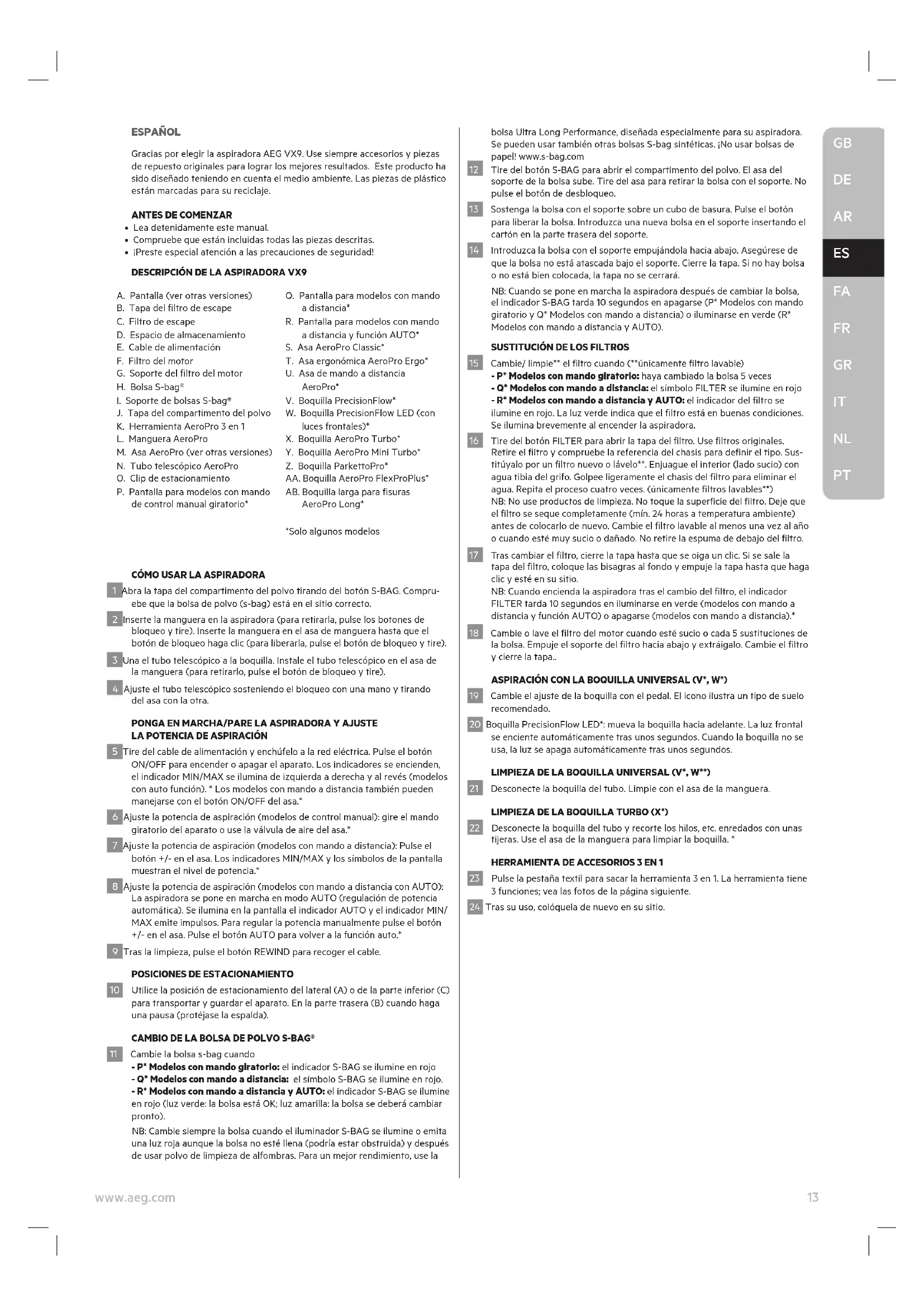 El libro de instructuciones, la ficha españica de la aspiradora y la etiqueta energetica se pueda descargar de nuestra頁a web www.AEG.com.