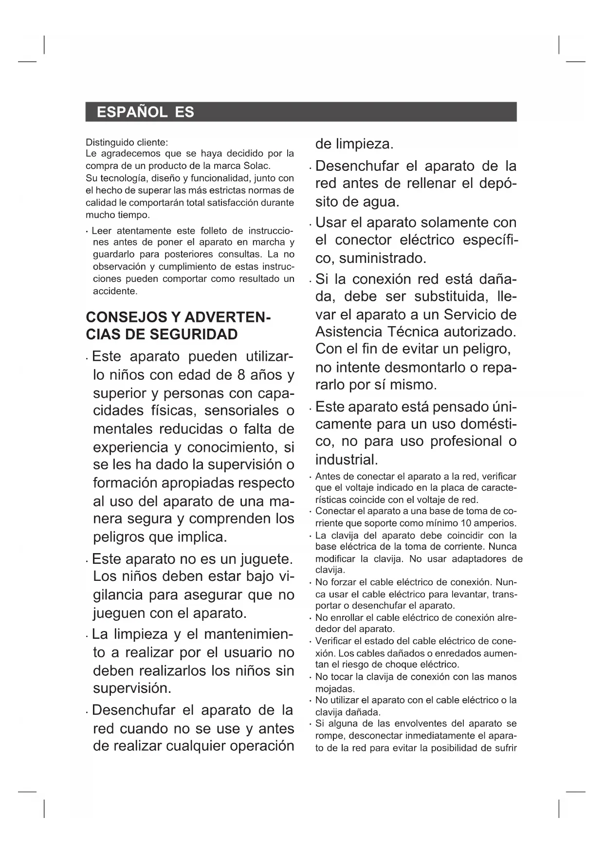 - El producto está exento de concentraciones de sustancias que se puedan considerar da- ñinas para el medio ambiente. Este símbolo signica que si desea des- hacerse del producto, una vez transcu- rrida la vida del mismo, debe depositar- lo por los medios adecuados a manos de un gestor de residuos autorizado para la recogida selectiva de Residuos de Aparatos Eléctricos y Electrónicos (RAEE). Este aparato cumple con la Directiva 2014/35/ EU de Baja Tensión, con la Directiva 2014/30/ EU de Compatibilidad Electromagnética, con la Directiva 2011/65/EU sobre restricciones a la utilización de determinadas sustancias peligro- sas en aparatos eléctricos y electrónicos y con la Directiva 2009/125/EC sobre los requisitos de diseño ecológico aplicable a los productos relacionados con la energía.ENGLISH EN Dear customer, Many thanks for choosing to purchase a Solac brand product. Thanks to its technology, design and operation and the fact that it exceeds the strictest quality standards, a fully satisfactory use and long prod- uct life can be assured.