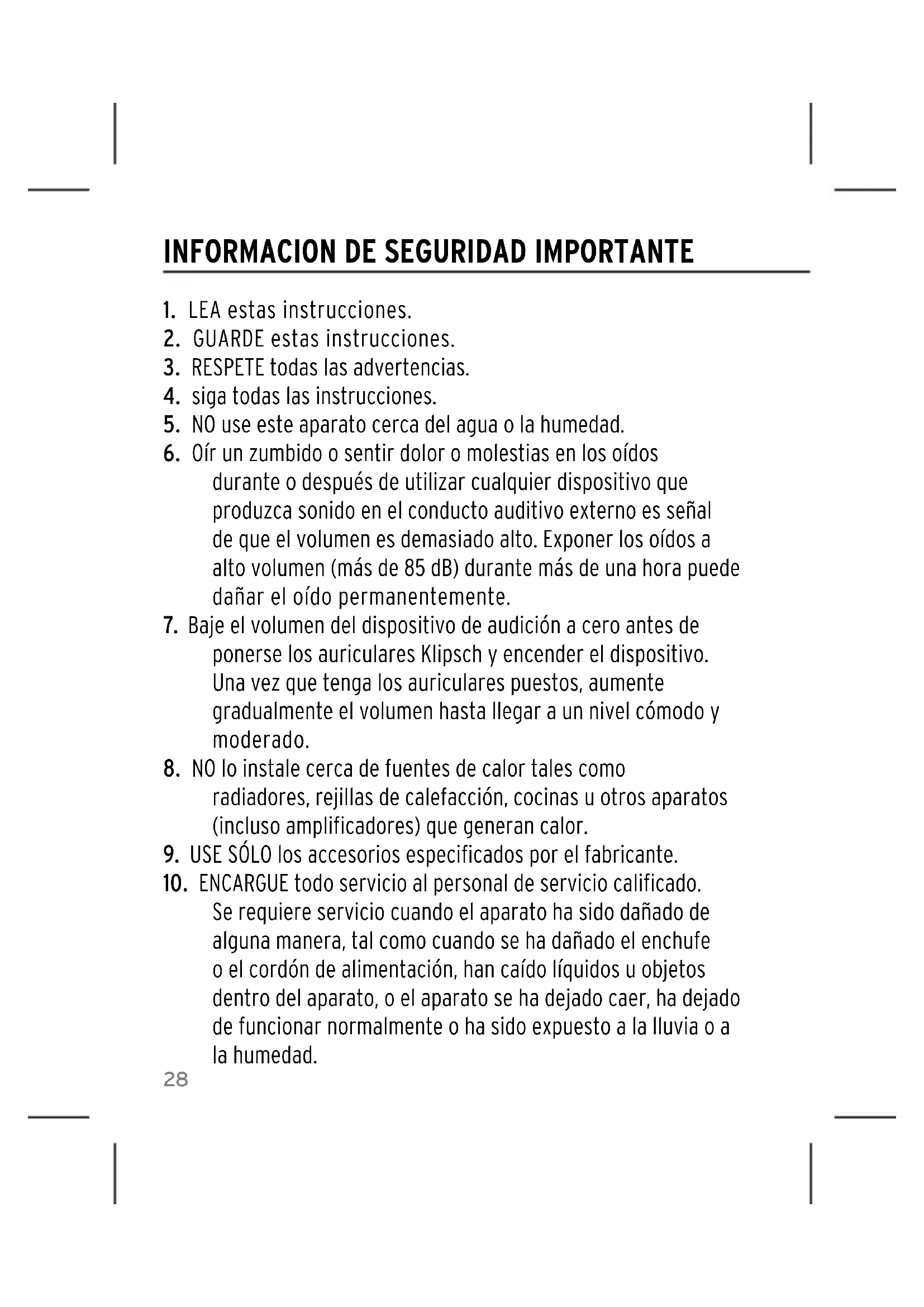 bicicleta, corra, o camine en lugares con mucho tráfico. ADVERTENCIA: Excepto en caso de emergencia, Klipsch recomienda no usar estos auriculares o auriculares con micrófono como equipo de comunicación de aviación, pues no han sido diseñados para muchas de las condiciones ambientales comunes en aeronaves comerciales o no comerciales (tales como, entre otras, altitud, temperatura, ruido, carencia de presurización, etc.) lo cual puede dar como resultado interferencia en comunicaciones de importancia crítica. La Administración de Salud y Seguridad Ocupacional (Occupational Safety and Health Administration, OSHA) ha emitido recomendaciones sobre máximos de exposición diaria y presión de sonido (medida en decibeles {dB}). El decibel es una unidad de medida de sonido. Los decibeles aumentan exponencialmente a medida que aumenta el volumen. Por ejemplo, la conversación normal se produce por lo general a aproximadamente 60 dB; un concierto de rock en un estadio genera a menudo 110 dB.30 Presión de sonido Exposición diaria máxima recomendada 90dB 8 Horas 92dB 6 Horas 95dB 4 Horas 97dB 3 Horas 100dB 2 Horas 102dB 1.5 Horas 105dB 1 Horas 110dB 30 Minutos 115dB 15 Minutos o menos 120dB Evítela, pues puede hacer daño PAUTAS DE LA OSHA SOBRE LÍMITES DE EXPOSICIÓN AL RUIDO31 INFORMACIÓN INFORMACIÓN DE CONFORMIDAD EN LA UNIÓN EUROPEA (EUROPEAN UNION, EU) Tiene derecho a llevar la marca CE; satisface la directiva de bajo voltaje 2006/95/EC de la Unión Europea; la directiva de EMC 2004/108/EC de la Unión Europea; la directiva de Restricción de Sustancias Peligrosas (Restriction of Hazardous Substances, RoHS) 2002/95/EC de la Unión Europea; la directiva de Desechos de Equipo Eléctrico y Electrónico (DEEE) (Waste Electrical and Electronic Equipment, WEEE) 2002/96/EC de la Unión Europea y la directiva de Registro, Evaluación y Autorización de Sustancias y Preparados Químicos (Registration, Evaluation and Authorization of Chemicals, REACH) 2006/121/EC de la Unión Europea. Este producto contiene pilas cubiertas por la directiva 2006/66/EC de la Unión Europea, que estipula que no se pueden desechar con los desperdicios domésticos normales. Siga los reglamentos locales. Puede obtener una copia gratis de la Declaración de conformidad comunicándose con el minorista, el distribuidor o las oficinas centrales mundiales de Klipsch Group, Inc. La información de contacto se encuentra en: http://www.klipsch.com/Contact-Us