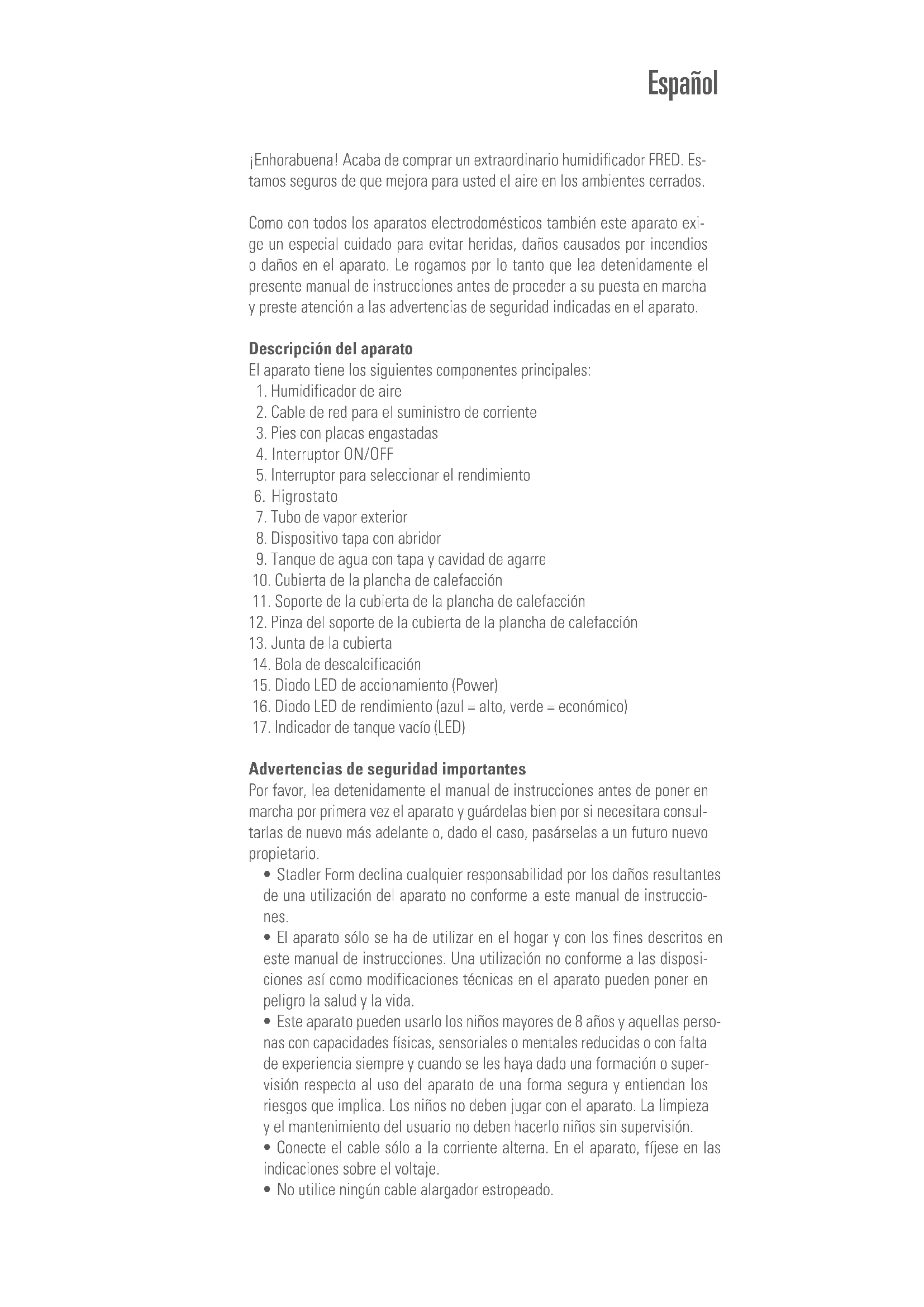 - Precaución: ¡vapor muy caliente! Se debe tener cuidado cuando se use el aparato debido a la emisión de vapor de agua caliente. Nota No ponga en funcionamiento el humidificador Fred con agua descalcificada fuera de un sistema de descalcificación que use el principio de un intercam- biador de iones (se añade sal al agua). Esto puede provocar un funciona- miento incorrecto y las consiguientes fugas del aparato. Puesta en marcha / Manejo