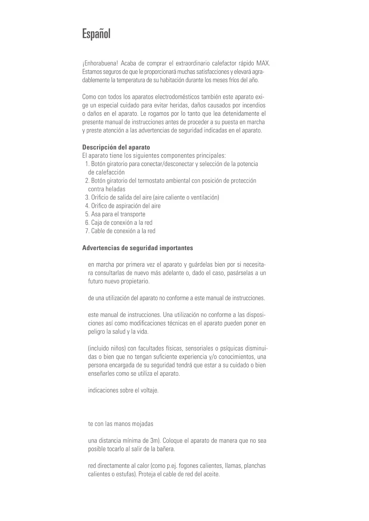MAX va equipado con un dispositivo de seguridad contra el recalentamiento que desconecta el aparato en caso de fallo技术和 de una utilizacion inadequada. Si se produjera este caso, disenchufe el cable de connexion a la red (7) del enchufe y repare el fallo o corrija el modo de uso. El aparato se pueda poder de nuevo en marcha cuando está bajo el nuevo antes de haber estado disenchufado durante un breve lapso de tiempo.