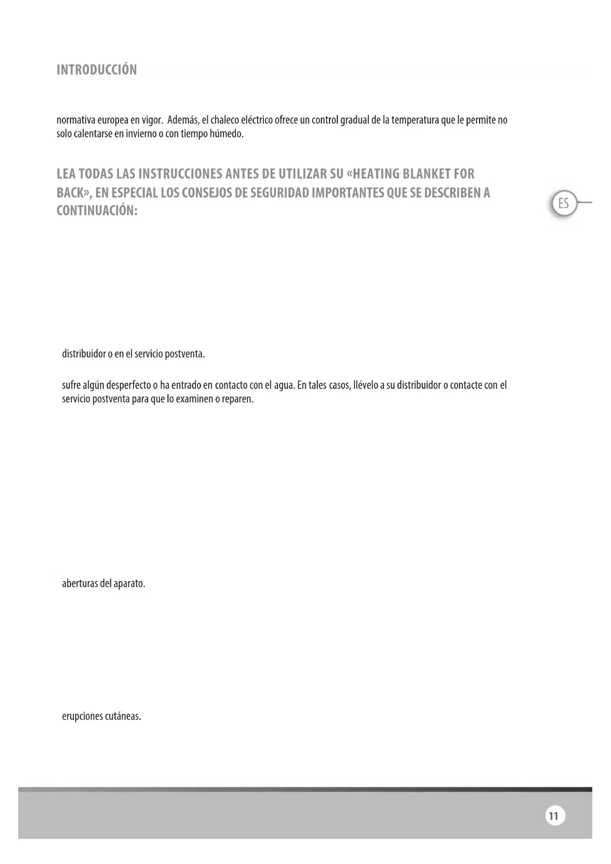 - Si va a guardar el chaleco eléctrico durante un tiempo prolongado, hágalo en un lugar seco. Compruebe cuidadosamente el estado del aparato antes de volver a ponerlo en marcha. Si el cable eléctrico presenta daños, no ponga en marcha el aparato y llévelo a su distribuidor o al servicio postventa.