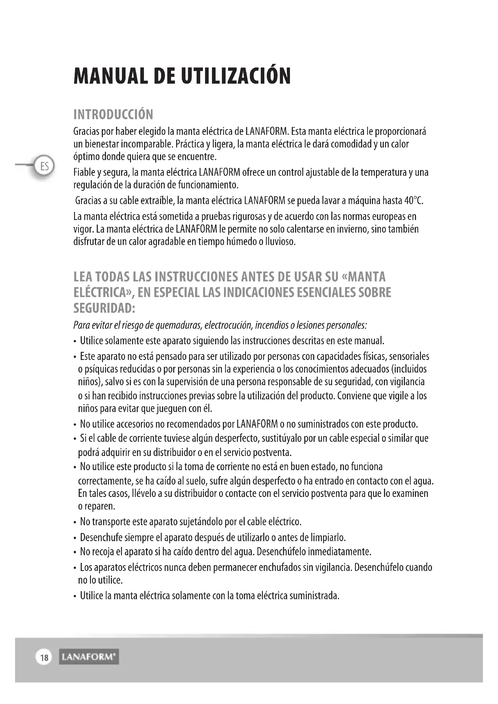 INTRODUCCIÓN Gracias por haber elegido la manta eléctrica de LANAFORM. Esta manta eléctrica le proporcionará un bienestar incomparable. Práctica y ligera, la manta eléctrica le dará comodidad y un calor óptimo donde quiera que se encuentre. Fiable y segura, la manta eléctrica LANAFORM ofrece un control ajustable de la temperatura y una regulación de la duración de funcionamiento. Gracias a su cable extraíble, la manta eléctrica LANAFORM se pueda lavar a máquina hasta 40°C. La manta eléctrica está sometida a pruebas rigurosas y de acuerdo con las normas europeas en vigor. La manta eléctrica de LANAFORM le permite no solo calentarse en invierno, sino también disfrutar de un calor agradable en tiempo húmedo o lluvioso. LEA TODAS LAS INSTRUCCIONES ANTES DE USAR SU «MANTA ELÉCTRICA», EN ESPECIAL LAS INDICACIONES ESENCIALES SOBRE SEGURIDAD: Para evitar el riesgo de quemaduras, electrocución, incendios o lesiones personales: