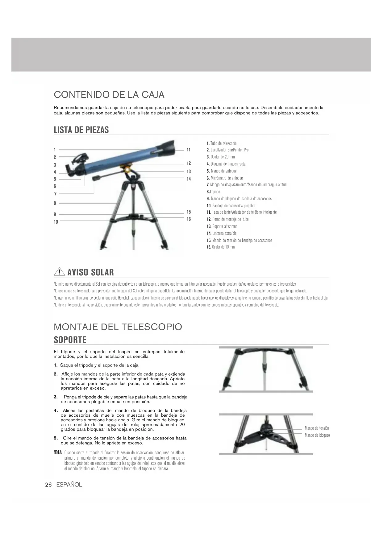 SOPORTE El trípode y el soporte del Inspire se entregan totalmente montados, por lo que la instalación es sencilla.1. Saque el trípode y el soporte de la caja.2. Afloje los mandos de la parte inferior de cada pata y extienda la sección interna de la pata a la longitud deseada. Apriete los mandos para asegurar las patas, con cuidado de no apretarlos en exceso.3. Ponga el trípode de pie y separe las patas hasta que la bandeja de accesorios plegable encaje en posición.4. Alinee las pestañas del mando de bloqueo de la bandeja de accesorios de muelle con muescas en la bandeja de accesorios y presione hacia abajo. Gire el mando de bloqueo en el sentido de las agujas del reloj aproximadamente 20 grados para bloquear la bandeja en posición.5. Gire el mando de tensión de la bandeja de accesorios hasta que se detenga. No lo apriete en exceso. NOTA: Cuando cierre el trípode al finalizar la sesión de observación, asegúrese de aflojar primero el mando de tensión por completo, y afloje a continuación el mando de bloqueo girándolo en sentido contrario a las agujas del reloj jasta que el muelle eleve el mando de bloqueo. Agarre el mando y levántelo, el trípode se plegará.