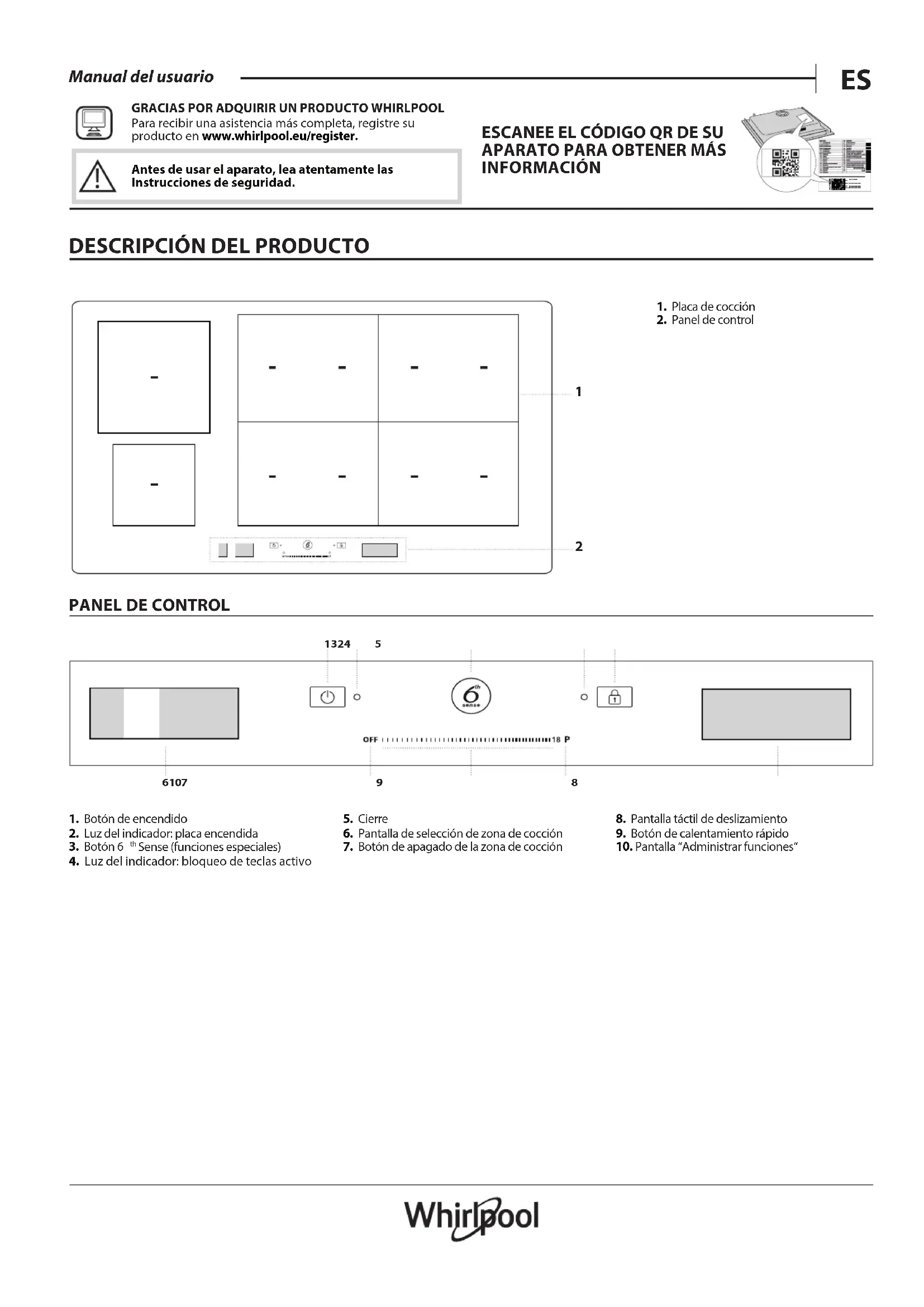 La siguiente tabla se ha creado especialmente para que los organismos de inspección puedan utilizar nuestros productos. Distribución de calor, prueba de “Tortitas“ de acuerdo con la norma EN 60350-2 §7.3 Rendimiento térmico, prueba de “Patatas fritas“ de acuerdo con la norma EN 60350-2 §7.4 Derretir “chocolate“ y mantenerlo caliente Cocer a fuego lento “arroz con leche“ DISEÑO ECO: La prueba se ha realizado de conformidad con las normativas, seleccionando todas las zonas de cocción de la placa para formar una sola área o utilizando la función Flexifull. Cocción vericada Posiciones de cocción vericadaSERVICIO POSTVENTA Para recibir una asistencia más completa, registre su producto en www . whirpool. eu/register. ANTES DE LLAMAR AL SERVICIO POSTVENTA: