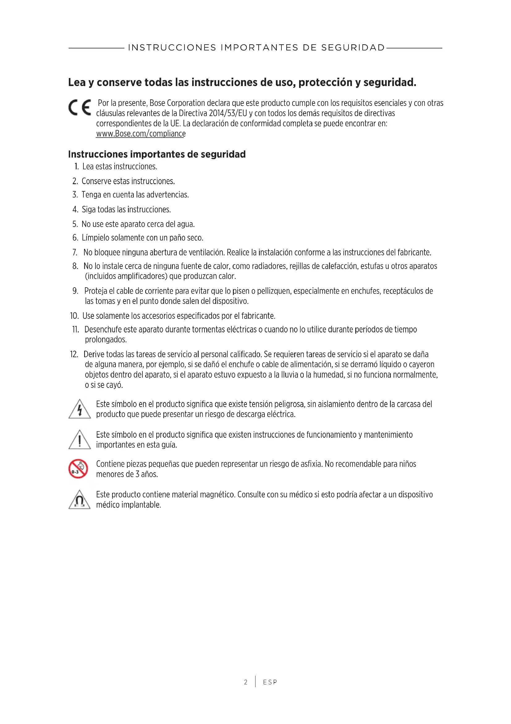ESP Lea y conserve todas las instrucciones de uso, protección y seguridad. Por la presente, Bose Corporation declara que este producto cumple con los requisitos esenciales y con otras cláusulas relevantes de la Directiva 2014/53/EU y con todos los demás requisitos de directivas correspondientes de la UE. La declaración de conformidad completa se puede encontrar en: www.Bose.com/compliance Instrucciones importantes de seguridad