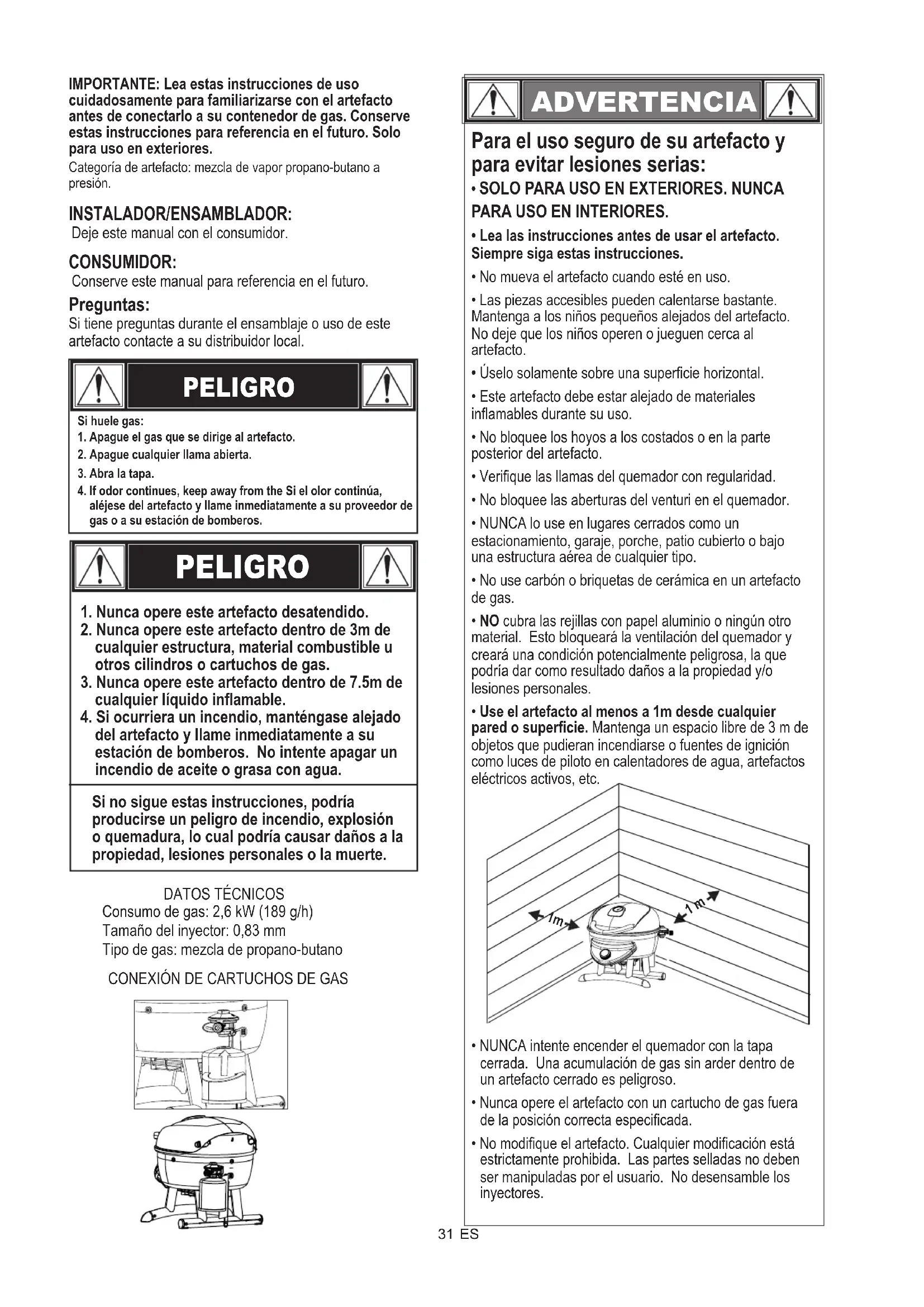 PELIGRO Si huele gas:1. Apague el gas que se dirige al artefacto.2. Apague cualquier llama abierta.3. Abra la tapa.4. If odor continues, keep away from the Si el olor continúa, aléjese del artefacto y llame inmediatamente a su proveedor de gas o a su estación de bomberos.DATOS TÉCNICOS PELIGRO Consumo de gas: 2,6 kW (189 g/h) Tamaño del inyector: 0,83 mmTipo de gas: mezcla de propano-butanoCONEXIÓN DE CARTUCHOS DE GAS1. Nunca opere este artefacto desatendido.2. Nunca opere este artefacto dentro de 3m de cualquier estructura, material combustible u otros cilindros o cartuchos de gas.3. Nunca opere este artefacto dentro de 7.5m de cualquier líquido inflamable.4. Si ocurriera un incendio, manténgase alejado del artefacto y llame inmediatamente a su estación de bomberos. No intente apagar un incendio de aceite o grasa con agua.IMPORTANTE: Lea estas instrucciones de uso cuidadosamente para familiarizarse con el artefacto antes de conectarlo a su contenedor de gas. Conserve estas instrucciones para referencia en el futuro. Solo para uso en exteriores.Categoría de artefacto: mezcla de vapor propano-butano a presión. INSTALADOR/ENSAMBLADOR: Deje este manual con el consumidor. CONSUMIDOR: Conserve este manual para referencia en el futuro. Preguntas: Si tiene preguntas durante el ensamblaje o uso de este artefacto contacte a su distribuidor local. ADVERTENCIA Para el uso seguro de su artefacto y para evitar lesiones serias: