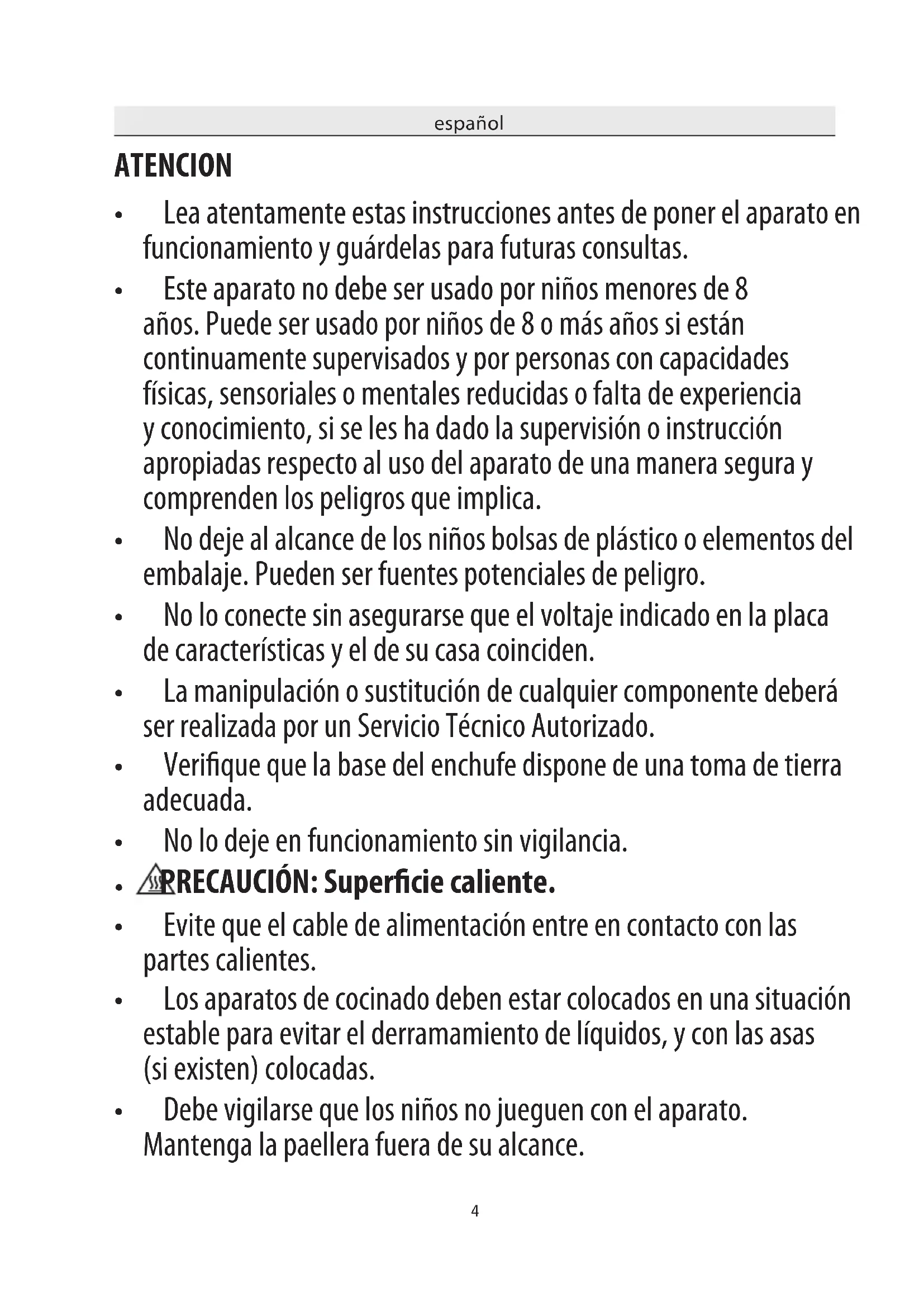 - Este aparato no debe ser usado por niños menores de 8 años. Puede ser usado por niños de 8 o más años si están continuamente supervisados y por personas con capacidades físicas, sensoriales o mentales reducidas o falta de experiencia y conocimiento, si se les ha dado la supervisión o instrucción apropiadas respecto al uso del aparato de una manera segura y comprenden los peligros que implica.
