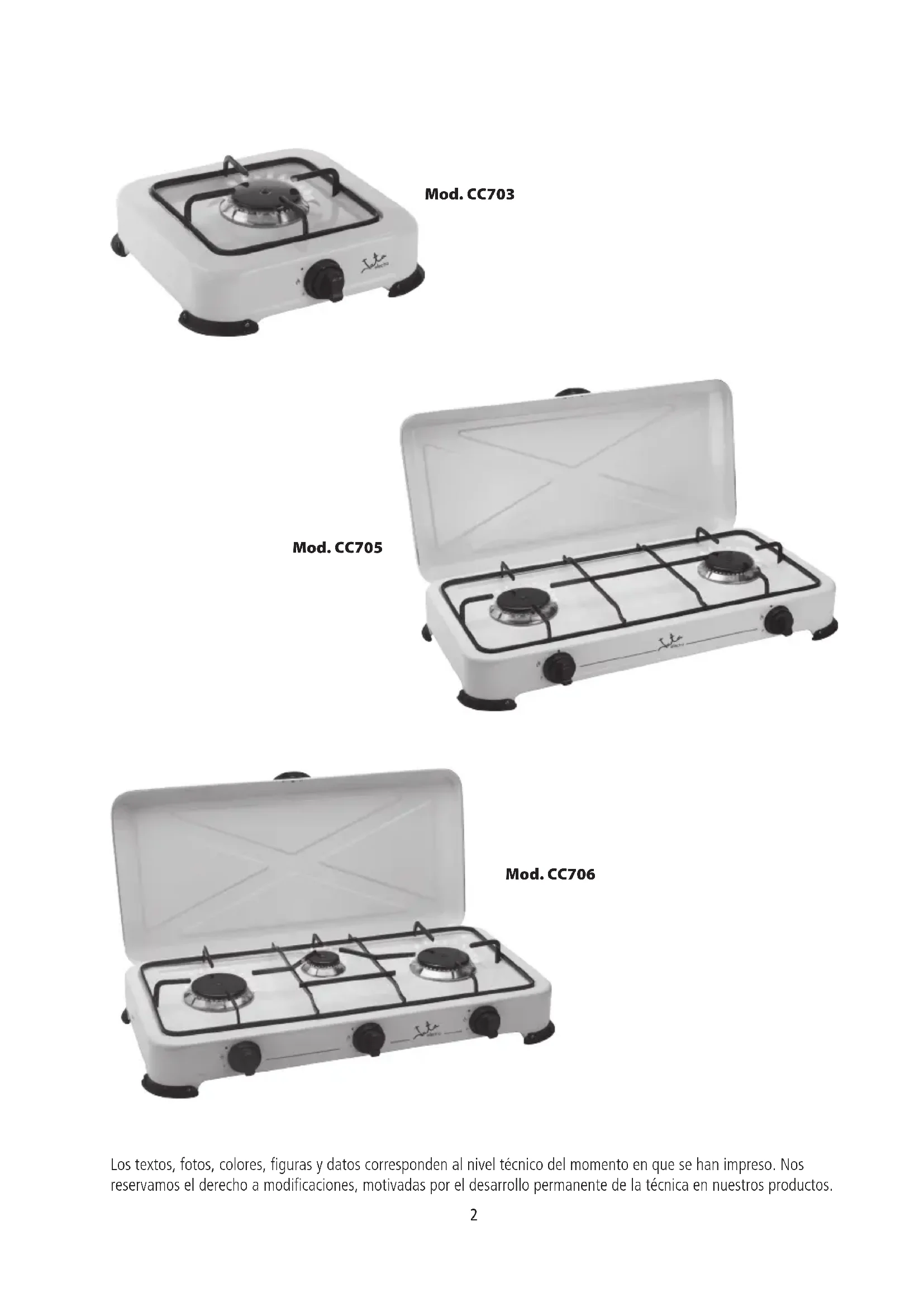 Los textos, fotos, colores, figuras y datos corresponden al nivel técnico del momento en que se han impreso. Nos reservamos el derecho a modificaciones, motivadas por el desarrollo permanente de la técnica en nuestros productos. 01 manual jata CC703-705-706.indd 2 29/06/17 10:483 ESPAÑOL CC703 Categoría Tipo de gas Presión (mBar) I3+ G30/31 28-30/37 Quemadores Inyectores (mm) Potencia (kW) Total