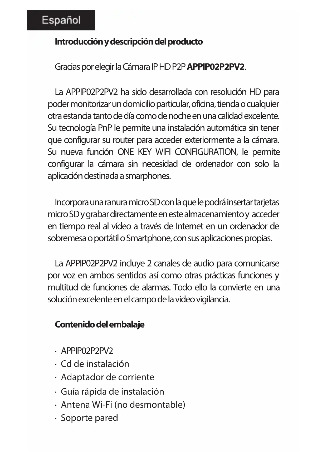 La APPIP02P2PV2 ha sido desarrollada con resolution HD para poder monitorizar un domicilio particular,-oficina, tienda o cualquier othera estancia tanto de dia como de noche en una calidad excellente. Su Tecnología PnP le permitte una instalación automatística sin tener que configurar su router para acceder exteriormente a la CAMERA. Suonga funciona ONE KEY WIFI CONFIGURATION, le permitted configurar la CAMERA sin necesidad de ordinador con solo la aplicación destinada a smartphones.