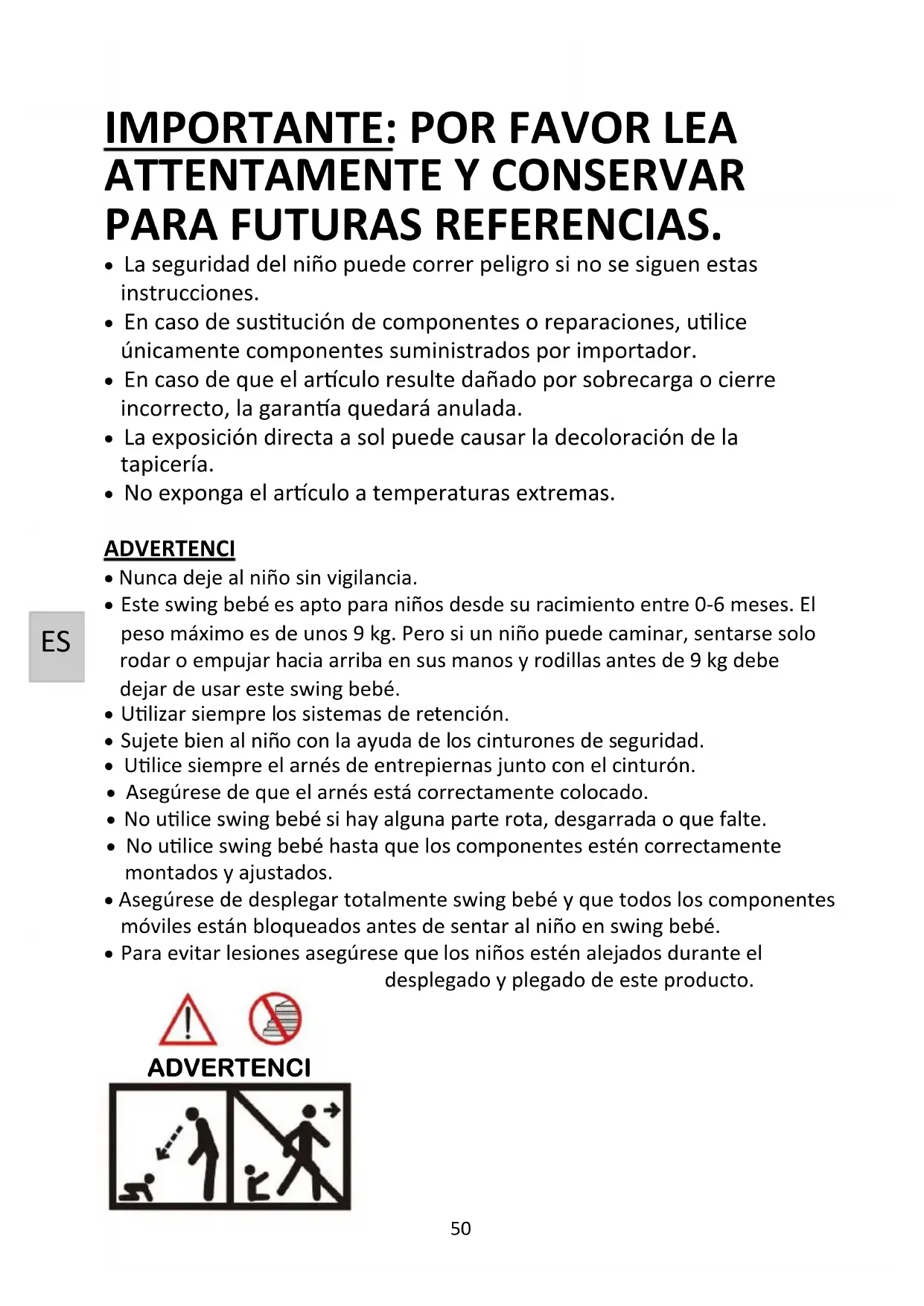 -Esta swing bebé no sustituya a una cuna o cama. Si el bebé necesita dormir, tendrá que ser colocado en una cuna o cama adecuades.