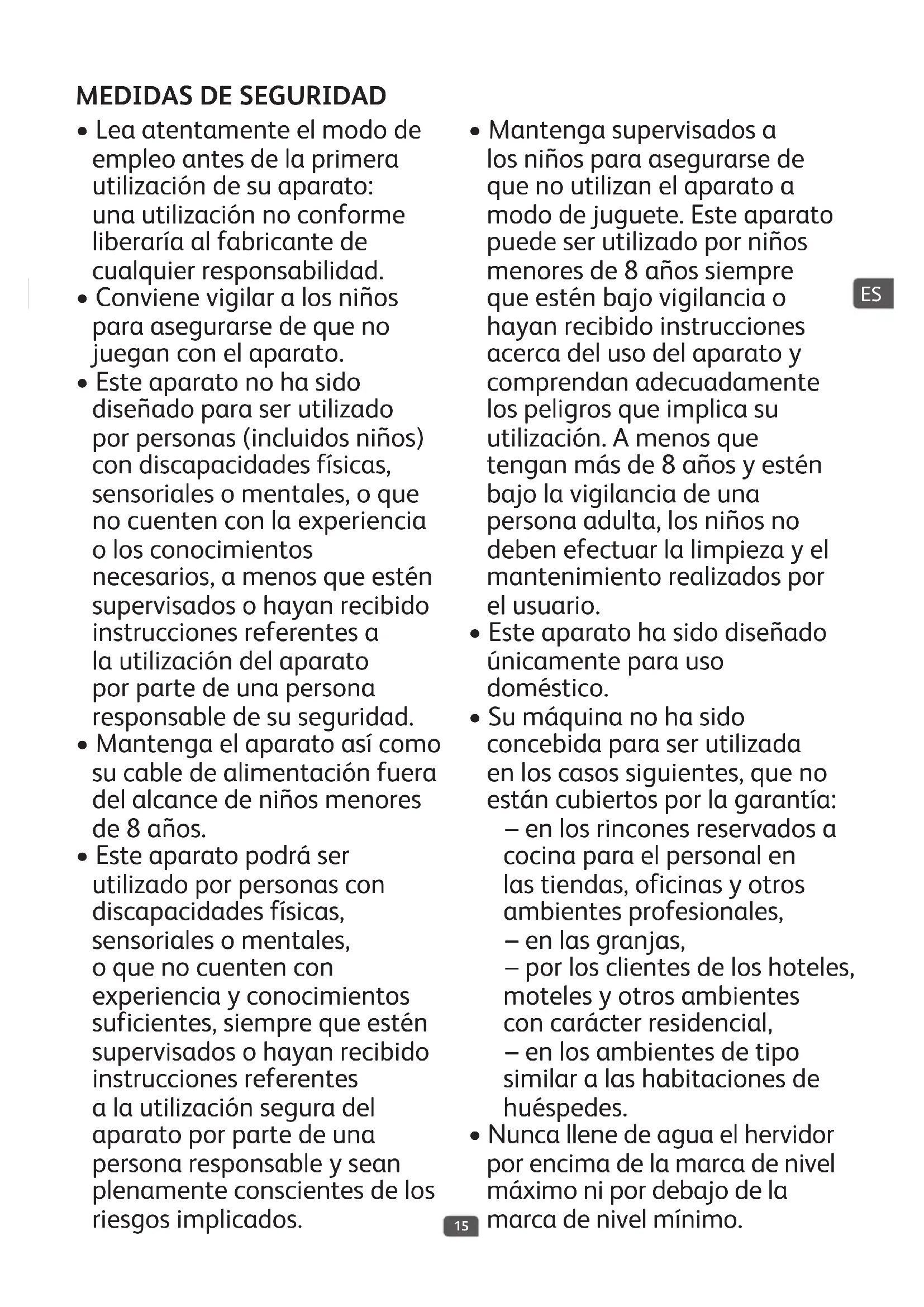 - Este aparato no ha sido diseñado para ser utilizado por personas (incluidos niños) con discapacidades físicas, sensoriales o mentales, o que no cuenten con la experiencia o los conocimientos necesarios, a menos que estén supervisados o hayan recibido instrucciones referentes a la utilización del aparato por parte de una persona responsable de su seguridad.