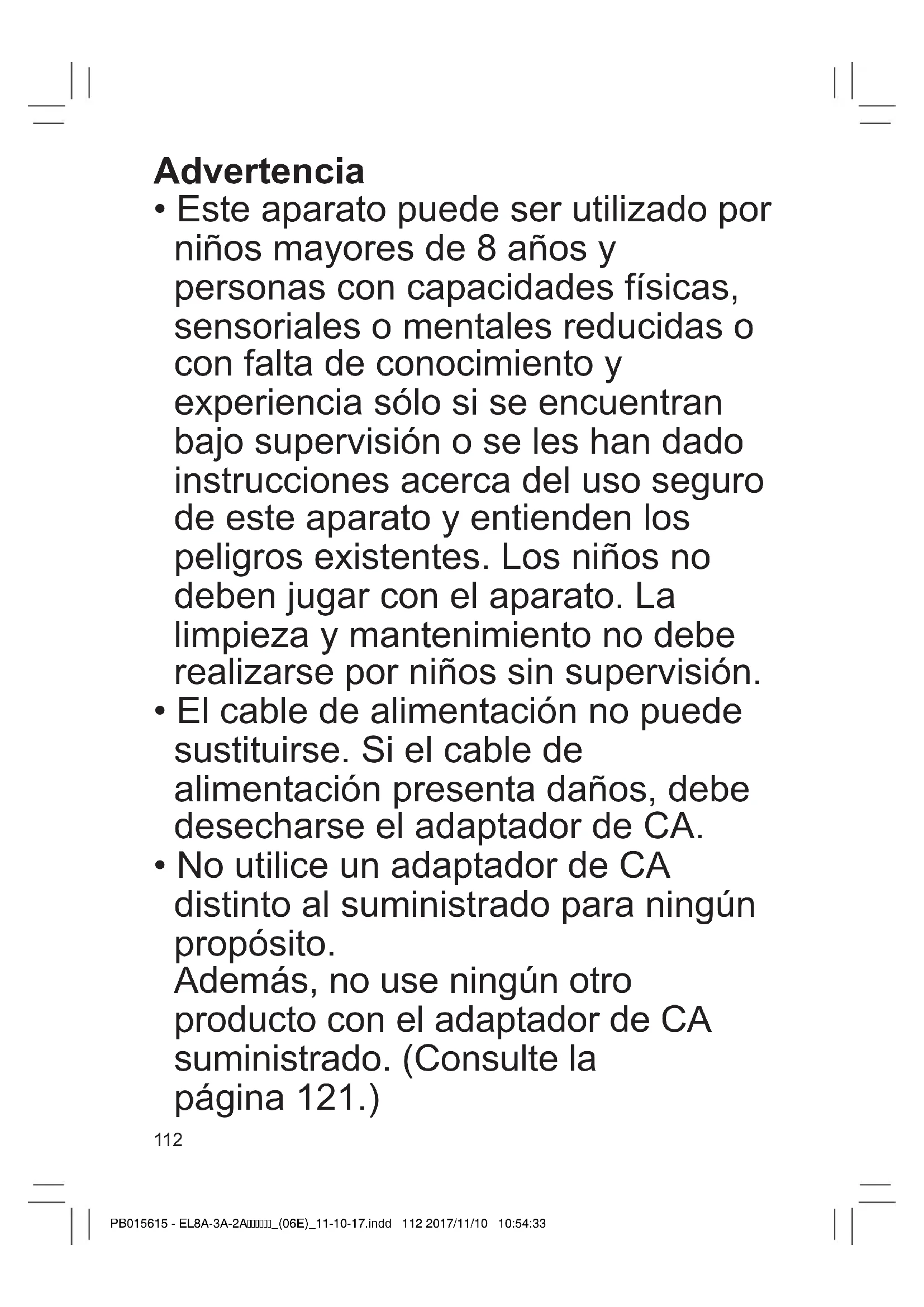- No utilice un adaptador de CA distinto al suministrado para ningún propósito. Además, no use ningún otro producto con el adaptador de CA suministrado. (Consulte la página 121.) PB015615 - EL8A-3A-2A_(06E)_11-10-17.indd 112 2017/11/10 10:54:33113 GBDFINLEDKPNSFINPLCZSKHROTR