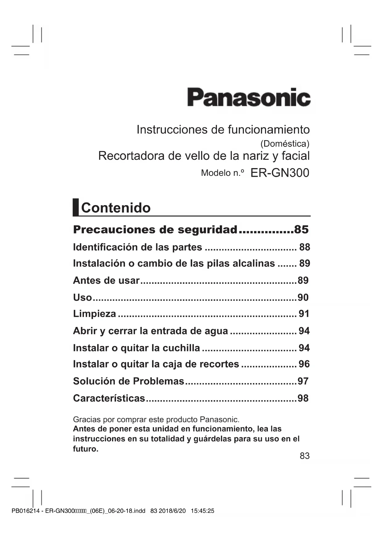 - Girar el anillo de cambio de lavado para alinearsumarca“ ”conlamarca “ ” del cuerpo principal. PB016214 - ER-GN300_(06E)_06-20-18.indd 96 2018/6/20 15:45:2997 Solución de Problemas Problema Acción Se ha reducido el rendimiento de corte. Sustituir la cuchilla. (Ver las páginas 94-95) Cambie las pilas alcalinas. (Ver página 89) Limpiar la hoja interior. (Ver las páginas 92-93) Hay un olor extraño. La cuchilla no se mueve/ gira fácilmente. La potencia de succión es baja. Limpiar la caja de recortes. (Ver las páginas 92-93). Cerrar la entrada de agua. (Ver las páginas 89 y 94). El aparato no está encendido. Colocar las pilas alcalinas correctamente. (Ver página 89). Cambie las pilas alcalinas. (Ver página 89). Si el problema todavía no se ha solucionado, póngase en contacto con la tienda donde compró el aparato o con un centro de servicio autorizado por Panasonic para su reparación. PB016214 - ER-GN300_(06E)_06-20-18.indd 97 2018/6/20 15:45:2998 Características Fuente de alimentación Pilas secas Tipo de pila Dos LR03 (pilas alcalinas AAA) (Se venden por separado) Ruido acústico aerotransportado 58 (dB (A) re 1 pW) Este producto está destinado solamente para su uso doméstico. Eliminación de Aparatos Viejos Solamente para la Unión Europea y países con sistemas de reciclado. Este símbolo en los productos, su embalaje o en los documentosquelosacompañensignicaquelos productos eléctricos y electrónicos usadas no deben mezclarse con los residuos domésticos. Para el adecuado tratamiento, recuperación y reciclaje de los productos viejos llévelos a los puntos de recogida de acuerdo con su legislación nacional. Si los elimina correctamente ayudará a preservar valuosos recursos y evitará potenciales efectos negativos sobre la salud de las personas y sobre el medio ambiente. Para más información sobre la recogida u reciclaje, por favor contacte con su ayuntamiento. Puede haber sanciones por una incorrecta eliminación de este residuo, de acuerdo con la legislación nacional. PB016214 - ER-GN300_(06E)_06-20-18.indd 98 2018/6/20 15:45:2999 Tak fordi du valgte dette Panasonic-produkt.Læs venligst alle instruktioner inden brug, og opbevar denne brugsanvisning på et sikkert sted. Brugsanvisning Næse- & ansigts-hårtrimmer (Husholdnings-) Modelnummer ER-GN300 Indhold Sikkerhedsforanstaltninger .............101 Identikation af dele ........................................... 104 Montering og udskiftning af alkaline-batterier ................................................. 105 Før brug ............................................................... 105 Brug ..................................................................... 106 Rengøring ............................................................ 107 Åbning og lukning af vandindtag ...................... 110 Montering eller fjernelse af bladene ................. 110 Montering eller fjernelse af trimmerboksen ..... 112 Fejlnding ........................................................... 113 Specikationer .................................................... 114 PB016214 - ER-GN300_(07DK)_06-20-18.indd 99 2018/6/20 15:23:49100 Advarsel
