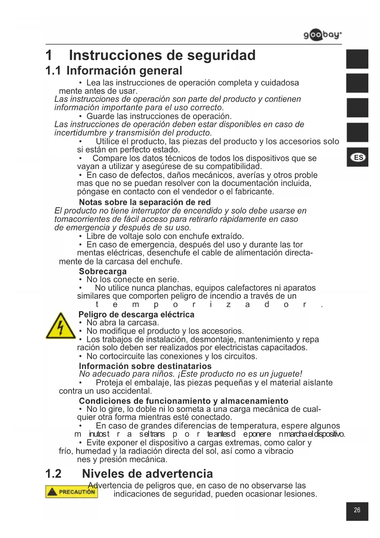 - Encasodedefectos,dañosmecánicos,averíasyotrosproble masquenosepuedanresolverconladocumentaciónincluida, póngaseencontactoconelvendedoroelfabricante. Notas sobre la separación de red El producto no tiene interruptor de encendido y solo debe usarse en tomacorrientes de fácil acceso para retirarlo rápidamente en caso de emergencia y después de su uso.