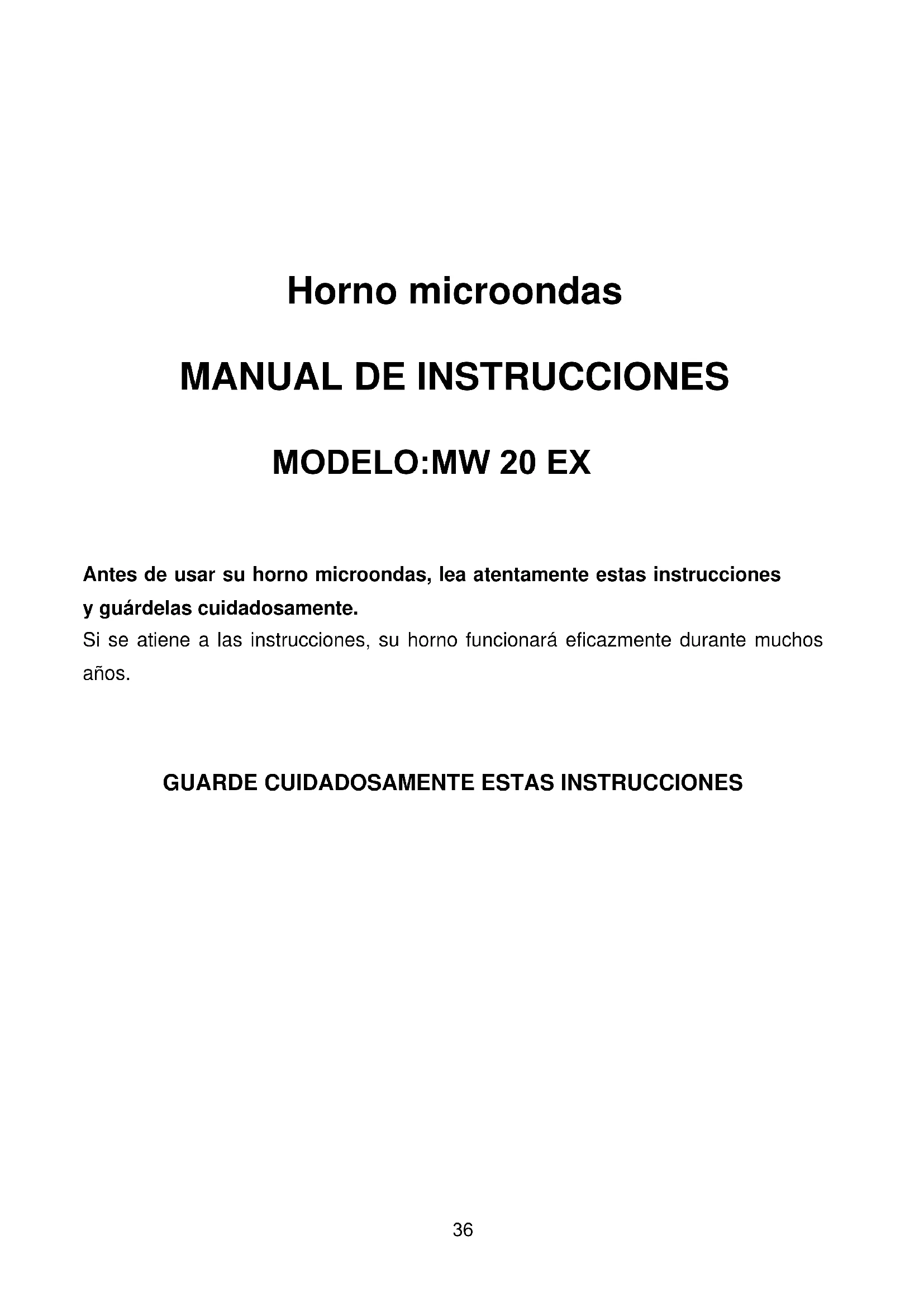 Antes de usar su horno microondas, lea atentamente estas instrucciones y guárdelas cuidadosamente. Si se atiene a las instrucciones, su horno funcionará eficazmente durante muchos años.