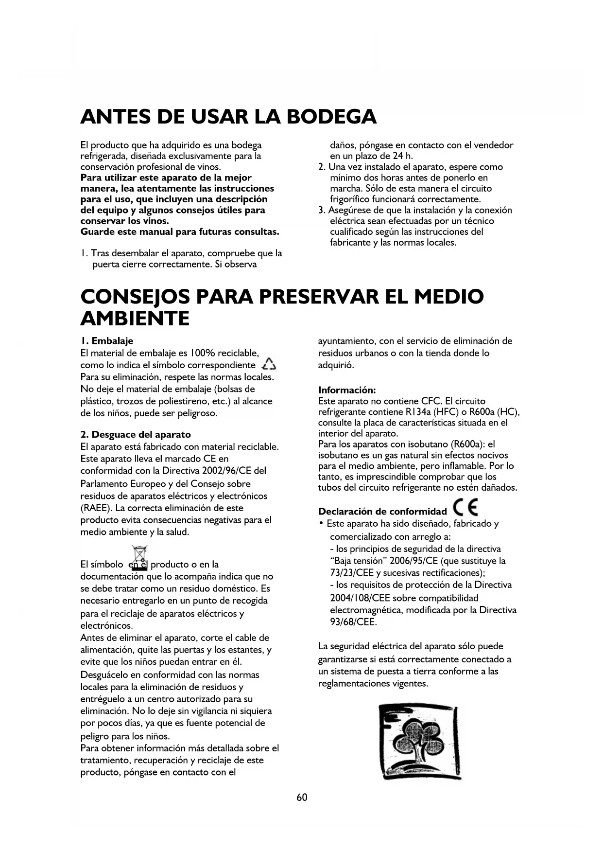 El producto que ha adquirido es una bodega refrigerada, diseñada exclusivamente para la conservación profesional de vinos. Para utilizar este aparato de la mejor manera, lea atentamente las instrucciones para el uso, que incluyen una descripción del equipo y algunos consejos útiles para conservar los vinos. Guarde este manual para futuras consultas.