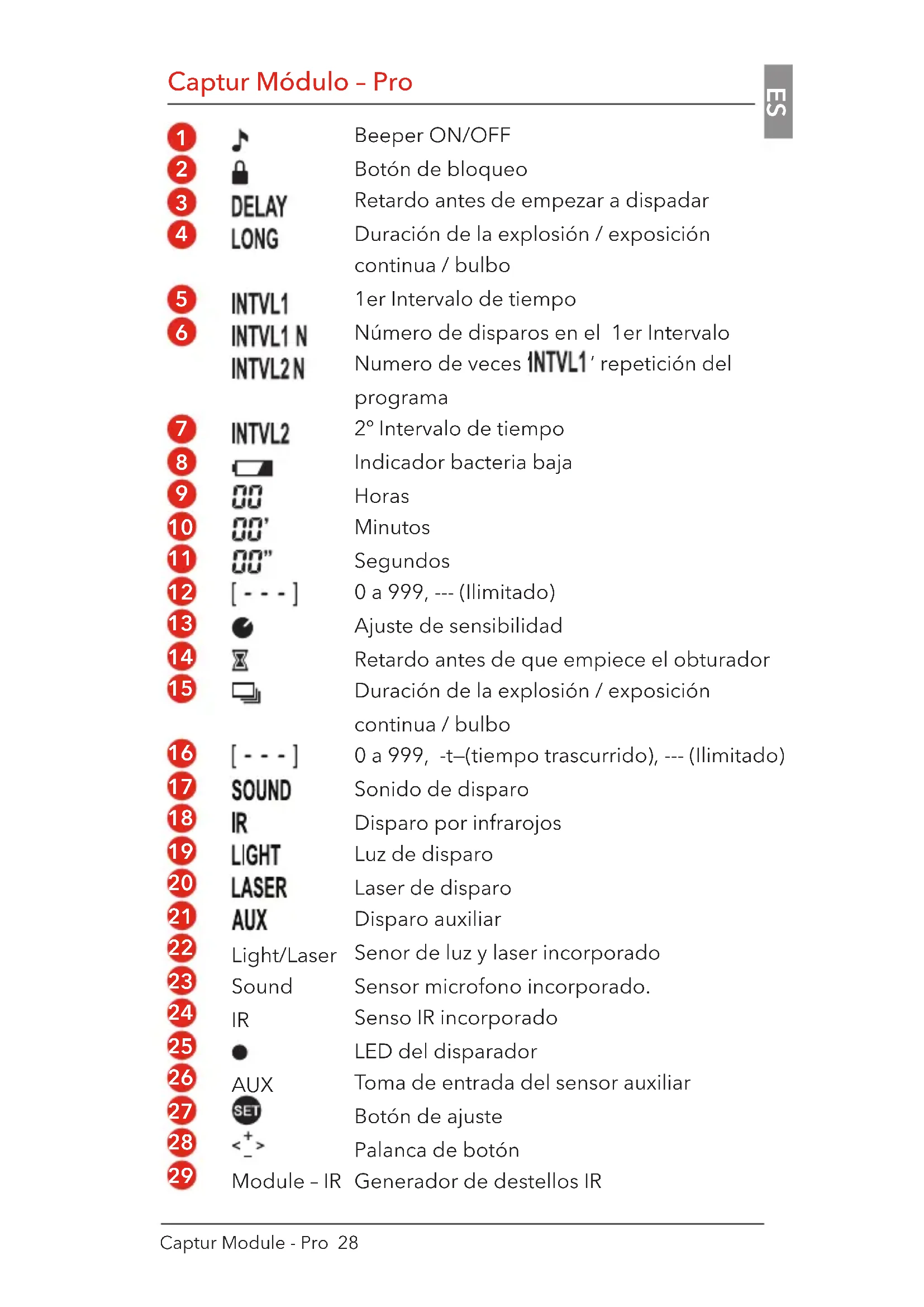 Hay variedos parámetros que se puedaaabustar para cada sensor del Captur Module - Pro. Utilice el botón Toggle 28< or > para mover de un sensor aanotherpara seleccionarelensorque necesita parámetrosaajustar. (porejemplo,irasound 17).Pulseelboton SET27a los parámetros ajustados.Botondecommutacion 28+ o-seutiliza paraaabustarelvalor de los parámetros (porejemplo,ajustaricono13a80paraunsono mas sensibleactivacion).Pulseelboton SET27de nuevopara confirmar el ajuste.