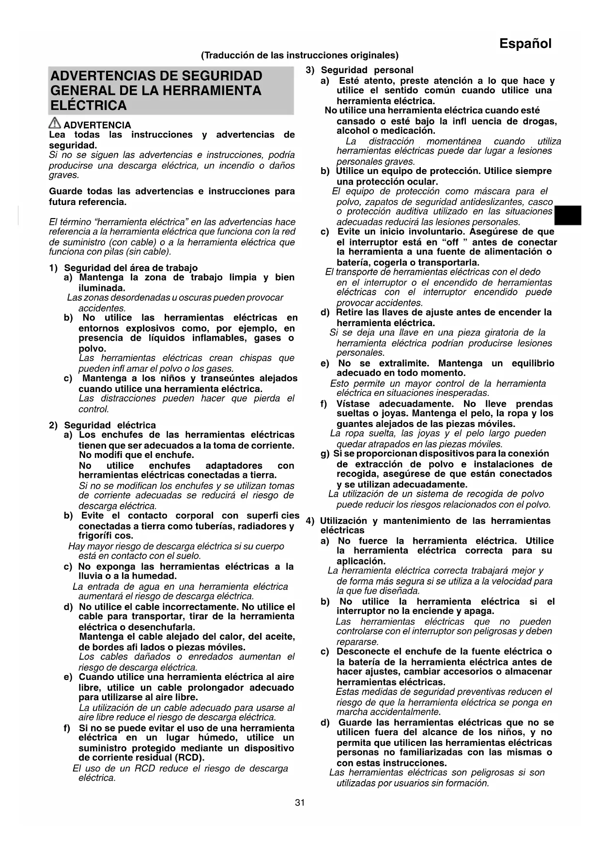 a) Los enchufes de las herramientas eléctricas tienen que ser adecuados a la toma de corriente. No modifi que el enchufe. No utilice enchufes adaptadores con herramientas eléctricas conectadas a tierra. Si no se modifi can los enchufes y se utilizan tomas de corriente adecuadas se reducirá el riesgo de descarga eléctrica. b) Evite el contacto corporal con superfi cies conectadas a tierra como tuberías, radiadores y frigorífi cos. Hay mayor riesgo de descarga eléctrica si su cuerpo está en contacto con el suelo. c) No exponga las herramientas eléctricas a la lluvia o a la humedad. La entrada de agua en una herramienta eléctrica aumentará el riesgo de descarga eléctrica. d) No utilice el cable incorrectamente. No utilice el cable para transportar, tirar de la herramienta eléctrica o desenchufarla. Mantenga el cable alejado del calor, del aceite, de bordes afi lados o piezas móviles. Los cables dañados o enredados aumentan el riesgo de descarga eléctrica. e) Cuando utilice una herramienta eléctrica al aire libre, utilice un cable prolongador adecuado para utilizarse al aire libre. La utilización de un cable adecuado para usarse al aire libre reduce el riesgo de descarga eléctrica. f) Si no se puede evitar el uso de una herramienta eléctrica en un lugar húmedo, utilice un suministro protegido mediante un dispositivo de corriente residual (RCD). El uso de un RCD reduce el riesgo de descarga eléctrica. (Traducción de las instrucciones originales) 0000BookG10SS2.indb310000BookG10SS2.indb31 2017/12/0413:45:022017/12/0413:45:0232 Español e) Realice el mantenimiento de las herramientas eléctricas. Compruebe si las piezas móviles están mal alineadas o unidas, si hay alguna pieza rota u otra condición que pudiera afectar al funcionamiento de las herramientas eléctricas. Si la herramienta eléctrica está dañada, llévela a reparar antes de utilizarla. Se producen muchos accidentes por no realizar un mantenimiento correcto de las herramientas eléctricas. f) Mantenga las herramientas de corte afi ladas y limpias. Las herramientas de corte correctamente mantenidas con los bordes de corte afi lados son más fáciles de controlar, y existe menor riesgo de que se atasquen. g) Utilice la herramienta eléctrica, los accesorios y las brocas de la herramienta, etc. de acuerdo con estas instrucciones, teniendo en cuenta las condiciones laborales y el trabajo que se va a realizar. La utilización de la herramienta eléctrica para operaciones diferentes a las previstas podría dar lugar a una situación peligrosa.