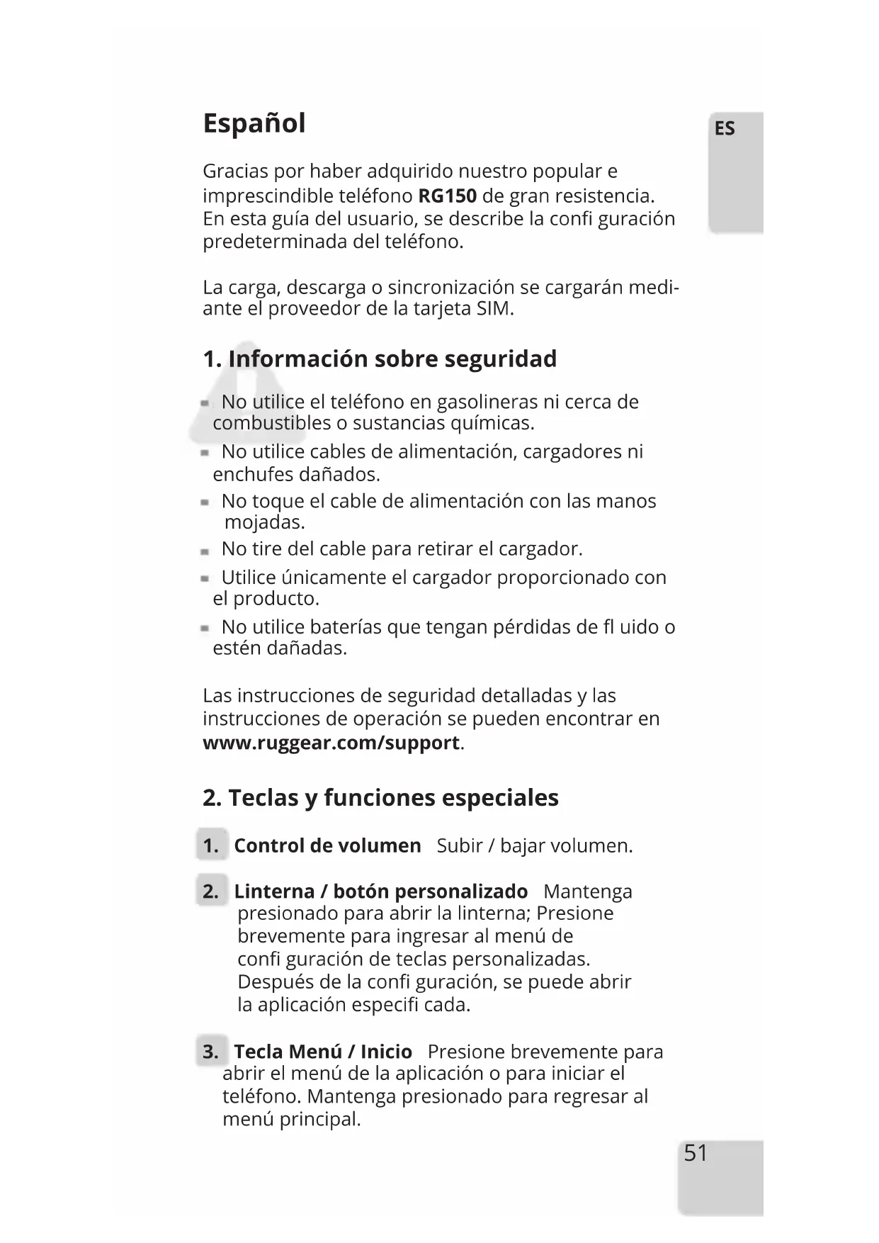 Gracias por haber adquirido nuestro popular e imprescindible teléfono RG150 de gran resistencia. En esta guía del usuario, se describe la confi guración predeterminada del teléfono.