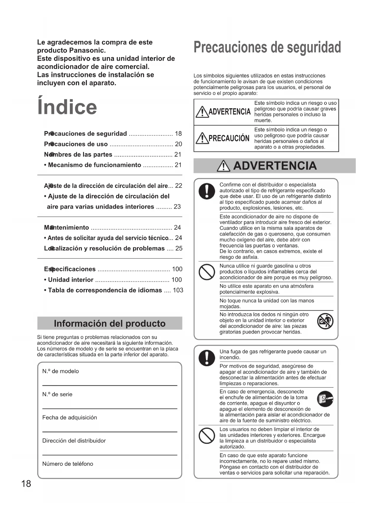 - Ceci an de permettre un fonctionnement en douceur. Vérier avant de nous contacter ou de demander une réparation. OI_F569617_EU_L.indb 17 2013-12-17 17:57:5618 zPrecauciones de seguridad ......................... 18 zPrecauciones de uso .................................... 20 zNombres de las partes ................................. 21•Mecanismo de funcionamiento ................. 21 zAjuste de la dirección de circulación del aire ... 22•Ajuste de la dirección de circulación del aire para varias unidades interiores ......... 23 zMantenimiento .............................................. 24•Antes de solicitar ayuda del servicio técnico ... 24 zLocalización y resolución de problemas .... 25 zEspecicaciones ......................................... 100•Unidad interior .......................................... 100•Tabla de correspondencia de idiomas .... 103 Índice Precauciones de seguridad Información del producto Si tiene preguntas o problemas relacionados con su acondicionador de aire necesitará la siguiente información. Los números de modelo y de serie se encuentran en la placa de características situada en la parte inferior del aparato.N.º de modelo N.º de serie Fecha de adquisiciónDirección del distribuidorNúmero de teléfonoConrme con el distribuidor o especialista autorizado el tipo de refrigerante especicado que debe usar. El uso de un refrigerante distinto al tipo especicado puede acarrear daños al producto, explosiones, lesiones, etc.Este acondicionador de aire no dispone de ventilador para introducir aire fresco del exterior. Cuando utilice en la misma sala aparatos de calefacción de gas o queroseno, que consumen mucho oxígeno del aire, debe abrir con frecuencia las puertas o ventanas. De lo contrario, en casos extremos, existe el riesgo de asxia.Nunca utilice ni guarde gasolina u otros productos o líquidos inamables cerca del acondicionador de aire porque es muy peligroso.No utilice este aparato en una atmósfera potencialmente explosiva.No toque nunca la unidad con las manos mojadas.No introduzca los dedos ni ningún otro objeto en la unidad interior o exterior del acondicionador de aire: las piezas giratorias pueden provocar heridas.Una fuga de gas refrigerante puede causar un incendio.Por motivos de seguridad, asegúrese de apagar el acondicionador de aire y también de desconectar la alimentación antes de efectuar limpiezas o reparaciones.En caso de emergencia, desconecte el enchufe de alimentación de la toma de corriente, apague el disyuntor o apague el elemento de desconexión de la alimentación para aislar el acondicionador de aire de la fuente de suministro eléctrico.Los usuarios no deben limpiar el interior de las unidades interiores y exteriores. Encargue la limpieza a un distribuidor o especialista autorizado.En caso de que este aparato funcione incorrectamente, no lo repare usted mismo. Póngase en contacto con el distribuidor de ventas o servicios para solicitar una reparación.Los símbolos siguientes utilizados en estas instrucciones de funcionamiento le avisan de que existen condiciones potencialmente peligrosas para los usuarios, el personal de servicio o el propio aparato: ADVERTENCIA Este símbolo indica un riesgo o uso peligroso que podría causar graves heridas personales o incluso la muerte. PRECAUCIÓN Este símbolo indica un riesgo o uso peligroso que podría causar heridas personales o daños al aparato o a otras propiedades. ADVERTENCIA Le agradecemos la compra de este producto Panasonic.Este dispositivo es una unidad interior de acondicionador de aire comercial.Las instrucciones de instalación se incluyen con el aparato. OI_F569617_EU_L.indb 18 2013-12-17 17:57:5719 ESPAÑOL Este aparato está pensado para ser utilizado por expertos o usuarios con la cualicación necesaria en tiendas, en la industria ligera y en granjas, o por no expertos en usos comerciales. Este dispositivo podrá ser utilizado por niños de más de 8 años y por personas con capacidades físicas, sensoriales o mentales reducidas o con falta de experiencia y conocimientos, siempre que estén bajo supervisión o hayan recibido instrucciones relativas al uso seguro del dispositivo y comprendan los riesgos que dicho uso conlleva. Instale la alarma contra incendios y la salida de aire a una distancia mínima de 1,5 m de la unidad. No caliente ni enfríe demasiado la sala si en ella se encuentran bebés o personas discapacitadas. No apague ni encienda el acondicionador de aire con el interruptor de alimentación. Utilice para ello el botón de operación de encendido/apagado (ON/ OFF). No introduzca nada en las salidas de aire de la unidad exterior. Esto es muy peligroso, porque el ventilador gira a alta velocidad. No toque la entrada de aire ni las aladas aletas de aluminio de la unidad exterior. Podría hacerse daño. No se siente ni se ponga de pie sobre la unidad. Podría caerse y sufrir un accidente. No pegue ningún objeto en la CARCASA DEL VENTILADOR. Podría sufrir lesiones y la unidad podría dañarse. Proporcione una toma de corriente que pueda utilizarse exclusivamente para cada unidad, e instale un disyuntor de circuito, un elemento de desconexión de la alimentación y un disyuntor de fugas a modo de protección contra sobrecorriente en la línea exclusiva. Proporcione una toma de corriente para cada unidad; y en el cableado jo deberán incorporarse medios para la desconexión completa del suministro eléctrico que tengan una separación de contacto en todos los polos en conformidad con las normas del cableado. Para prevenir posibles peligros a causa de un fallo en el aislamiento, la unidad debe conectarse a tierra. No utilice cables manipulados, empalmados, prolongados o de origen desconocido, para evitar sobrecalentamientos y riesgo de incendios. Deje de utilizar el producto cuando haya cualquier anormalidad/fallo y desconecte el cable de corriente o desactive el interruptor de alimentación y el interruptor. (Riesgo de humo/incendi