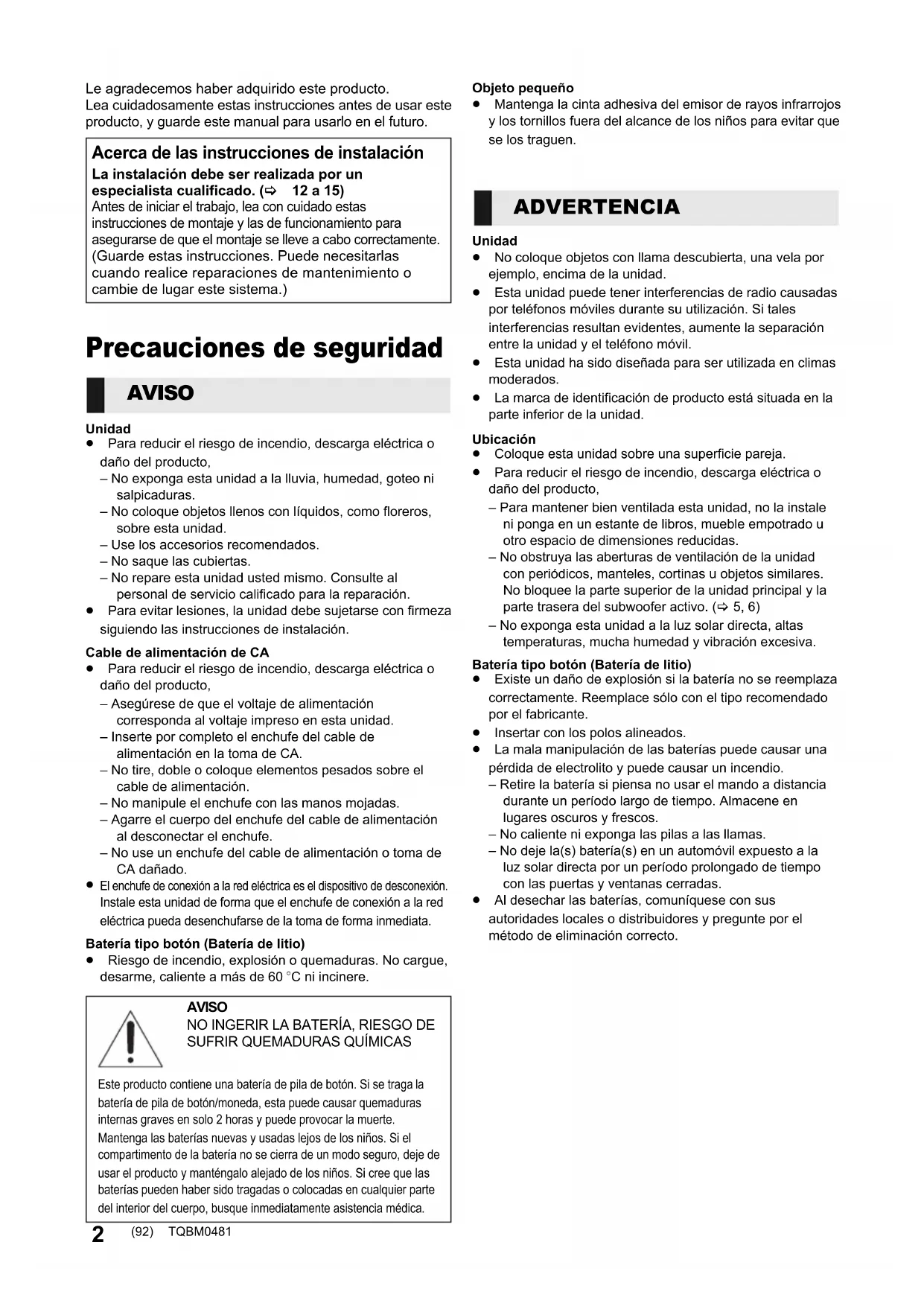 (91) SC-HTB700-EG-TQBM0481_ita.book 31 ページ 2019年6月6日 木曜日 午後1時3分2 TQBM0481 Le agradecemos haber adquirido este producto. Lea cuidadosamente estas instrucciones antes de usar este producto, y guarde este manual para usarlo en el futuro. Precauciones de seguridad Unidad≥ Para reducir el riesgo de incendio, descarga eléctrica o daño del producto,– No exponga esta unidad a la lluvia, humedad, goteo ni salpicaduras.– No coloque objetos llenos con líquidos, como floreros, sobre esta unidad.– Use los accesorios recomendados.– No saque las cubiertas.– No repare esta unidad usted mismo. Consulte al personal de servicio calificado para la reparación.≥ Para evitar lesiones, la unidad debe sujetarse con firmeza siguiendo las instrucciones de instalación.Cable de alimentación de CA≥ Para reducir el riesgo de incendio, descarga eléctrica o daño del producto,– Asegúrese de que el voltaje de alimentación corresponda al voltaje impreso en esta unidad.– Inserte por completo el enchufe del cable de alimentación en la toma de CA.– No tire, doble o coloque elementos pesados sobre el cable de alimentación.– No manipule el enchufe con las manos mojadas.– Agarre el cuerpo del enchufe del cable de alimentación al desconectar el enchufe.– No use un enchufe del cable de alimentación o toma de CA dañado. El enchufe de conexión a la red eléctrica es el dispositivo de desconexión.Instale esta unidad de forma que el enchufe de conexión a la red eléctrica pueda desenchufarse de la toma de forma inmediata.Batería tipo botón (Batería de litio)≥ Riesgo de incendio, explosión o quemaduras. No cargue, desarme, caliente a más de 60 oC ni incinere.Objeto pequeño≥ Mantenga la cinta adhesiva del emisor de rayos infrarrojos y los tornillos fuera del alcance de los niños para evitar que se los traguen.Unidad≥ No coloque objetos con llama descubierta, una vela por ejemplo, encima de la unidad.≥ Esta unidad puede tener interferencias de radio causadas por teléfonos móviles durante su utilización. Si tales interferencias resultan evidentes, aumente la separación entre la unidad y el teléfono móvil.≥ Esta unidad ha sido diseñada para ser utilizada en climas moderados.≥ La marca de identificación de producto está situada en la parte inferior de la unidad.Ubicación≥ Coloque esta unidad sobre una superficie pareja.≥ Para reducir el riesgo de incendio, descarga eléctrica o daño del producto,– Para mantener bien ventilada esta unidad, no la instale ni ponga en un estante de libros, mueble empotrado u otro espacio de dimensiones reducidas.– No obstruya las aberturas de ventilación de la unidad con periódicos, manteles, cortinas u objetos similares.No bloquee la parte superior de la unidad principal y la parte trasera del subwoofer activo. (> 5, 6) – No exponga esta unidad a la luz solar directa, altas temperaturas, mucha humedad y vibración excesiva.Batería tipo botón (Batería de litio)≥ Existe un daño de explosión si la batería no se reemplaza correctamente. Reemplace sólo con el tipo recomendado por el fabricante.≥ Insertar con los polos alineados.≥ La mala manipulación de las baterías puede causar una pérdida de electrolito y puede causar un incendio.– Retire la batería si piensa no usar el mando a distancia durante un período largo de tiempo. Almacene en lugares oscuros y frescos.– No caliente ni exponga las pilas a las llamas.– No deje la(s) batería(s) en un automóvil expuesto a la luz solar directa por un período prolongado de tiempo con las puertas y ventanas cerradas.≥ Al desechar las baterías, comuníquese con sus autoridades locales o distribuidores y pregunte por el método de eliminación correcto. Acerca de las instrucciones de instalación La instalación debe ser realizada por un especialista cualificado. (> 12 a 15) Antes de iniciar el trabajo, lea con cuidado estas instrucciones de montaje y las de funcionamiento para asegurarse de que el montaje se lleve a cabo correctamente. (Guarde estas instrucciones. Puede necesitarlas cuando realice reparaciones de mantenimiento o cambie de lugar este sistema.) AVISO AVISO NO INGERIR LA BATERÍA, RIESGO DE