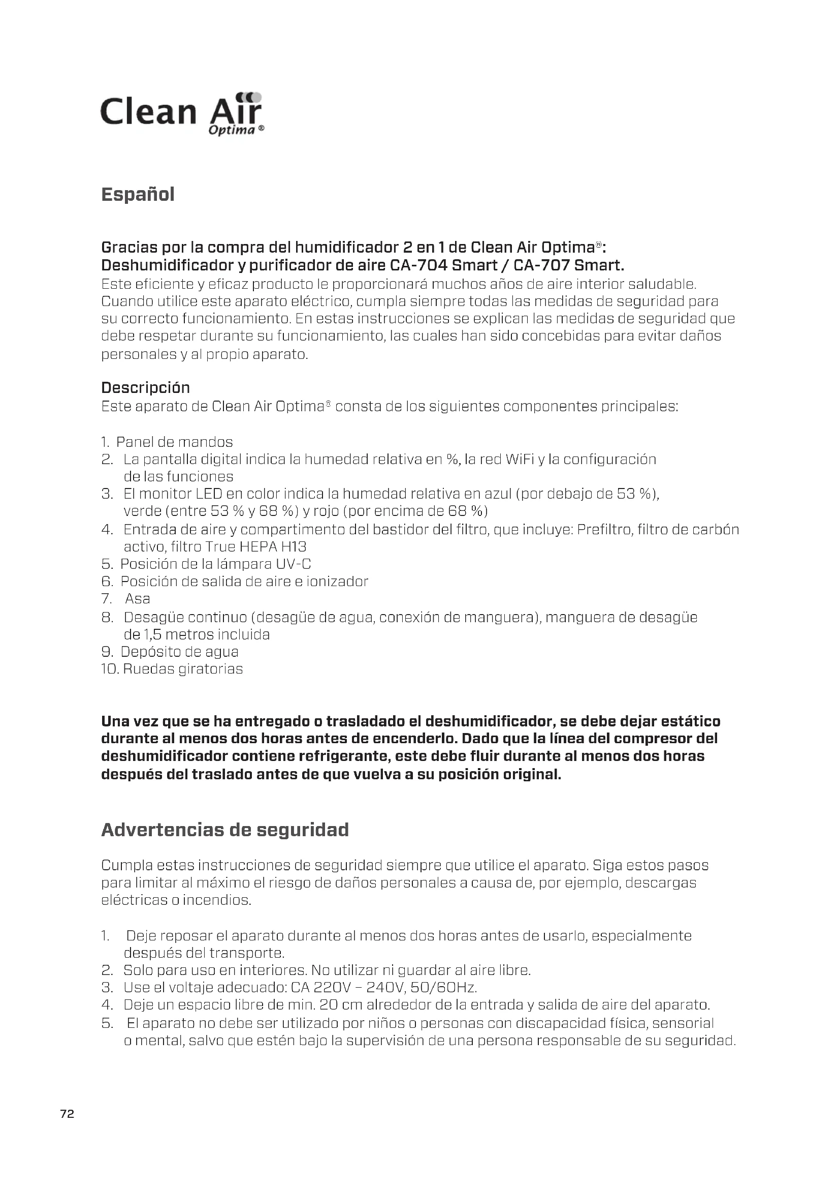 Gracias por la compra del humidificador 2 en 1 de Clean Air Optima: Deshumidificador y purificador de aire CA-704 Smart / CA-707 Smart.