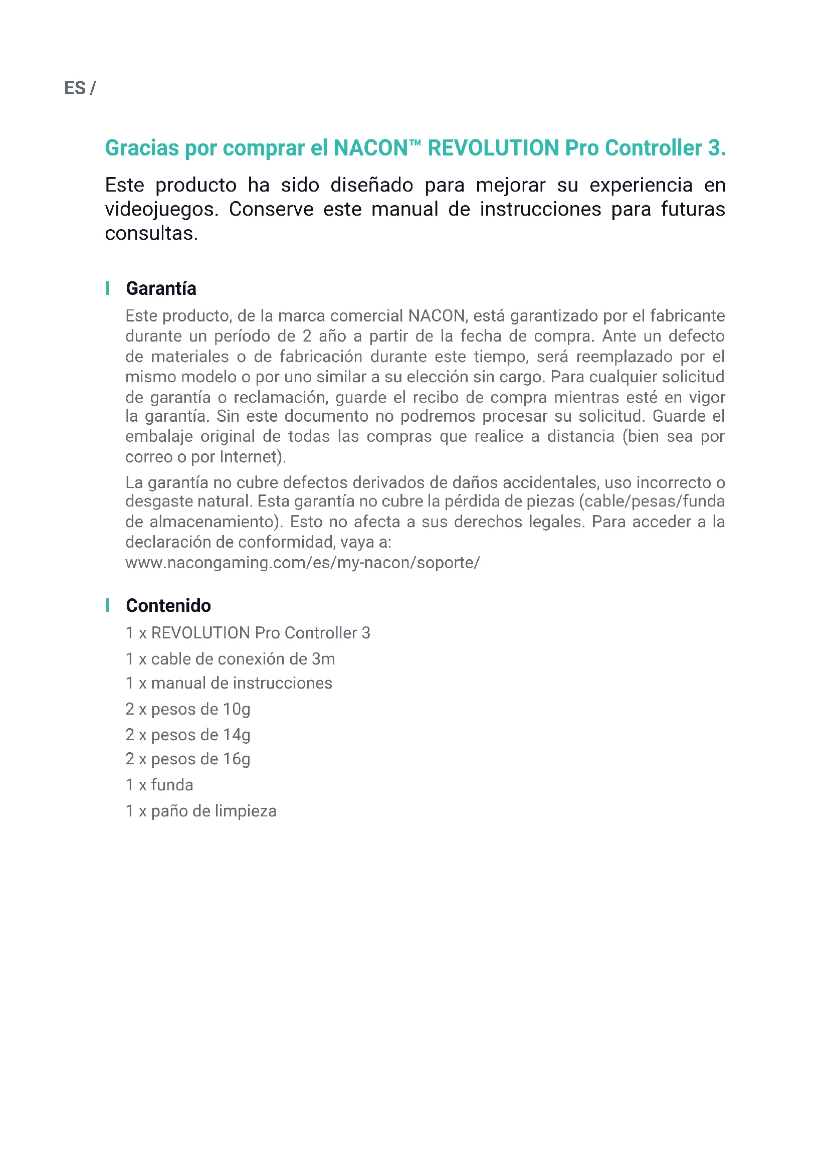 Arcade (reacción inmediata del stick).ES / Reciclado Al deshacerse de este producto, no debe tirarlo a la basura, llévelo a un punto de recogida apropiado. El reciclaje es importante para proteger el medio ambiente ya que reduce la cantidad de residuos en los vertederos. Sólo para la UE y Turquía. I Garantías y precauciones importantes 1/ El producto está hecho únicamente para su uso en interior. No se debe exponer nunca a la radiación solar directa ni a entornos húmedos. 2/ No exponer la unidad a salpicaduras, gotas de lluvia, ni humedad. No sumergir en líquido. 3/ No exponer al polvo, a entornos muy húmedos, temperaturas extremas ni golpes. 4/ No usar ni abrir si el equipo está dañado. No intente arreglarlo. 5/ Utilizar un paño suave, ligeramente húmedo y limpio para limpiarlo por fuera. El uso de detergentes puede producir filtraciones y dañar el acabado del aparato. 6/ No coger nunca el producto por el cable. 7/ Este dispositivo no está diseñado para ser utilizado por nadie (incluidos niños) con discapacidad física, sensorial o mental, ni por nadie sin la experiencia o el conocimiento adecuados; a menos que hayan recibido directrices o instruc- ciones previas sobre el uso de este dispositivo por parte de alguien que sea responsable de su seguridad. No deje el producto desatendido. Mantenga este dispositivo fuera del alcance de los niños. No apto para menores de 7 años, el cable puede enrollarse alrededor del cuello. I Ergonomía Mantener las manos en la misma posición durante un periodo de tiempo prolongado puede dar lugar a molestias y dolor. Si esto le sucediera de forma habitual, consulte a su médico. Como medida de precaución, le recomendamos descansar 15 minutos por cada hora de juego.ES / I Servicio de atención al cliente Para cualquier información, puede contactar con el departamento de asistencia. Antes de contactar con nosotros, asegúrese de disponer de la mayor cantidad de información posible sobre el problema y el producto. Dirección electrónica: support.es@nacongaming.com Página web: www.nacongaming.com Dirección postal: Bigben España - C/ Musgo 5, 2ª planta, 28023 Madrid, EspañaIT / Grazie per aver acquistato il NACON™ REVOLUTION Pro Controller 3. Il prodotto è stato creato per ottimizzare l'esperienza del videogaming. Conservare il presente manuale di istruzioni per l'eventuale consultazione futura. I Garanzia Questo prodotto, a marchio Nacon, è garantito dal produttore per un periodo di 2 anni dalla data d'acquisto e durante suddetto periodo sarà sostituito con uno dello stesso modello o simile, a nostra discrezione, senza costi aggiuntivi, qualora venga rilevato un difetto dovuto a un vizio del materiale o alla lavorazione del medesimo. Per qualsiasi reclamo o richiesta di garanzia, conservare la ricevuta fiscale o fattura per tutta la durata di garanzia del prodotto. In assenza di questo documento, non possiamo dare seguito alla vostra richiesta. Conservare l'imballaggio originale per tutti gli acquisti a distanza (tramite posta & Internet). La presente garanzia non copre i difetti derivanti da danni accidentali, uso improprio o normale usura. La garanzia non copre la perdita di parti originali (cavo / pesi / custodia). Ciò non si ripercuote sui diritti legali dell'acquirente. Per accedere alla dichiarazione di conformità, si rimanda al sito: www.nacongaming.com/it/my-nacon/supporto/ I Contenuto 1 x REVOLUTION Pro Controller 3 1 x Cavo di collegamento di 3m 1 x Manuale di istruzioni 2 x Pesi da 10g 2 x Pesi da 14g 2 x Pesi da 16g 1 x Custodia rigida 1 x Panno puliziaIT / I Descrizione degli elementi
