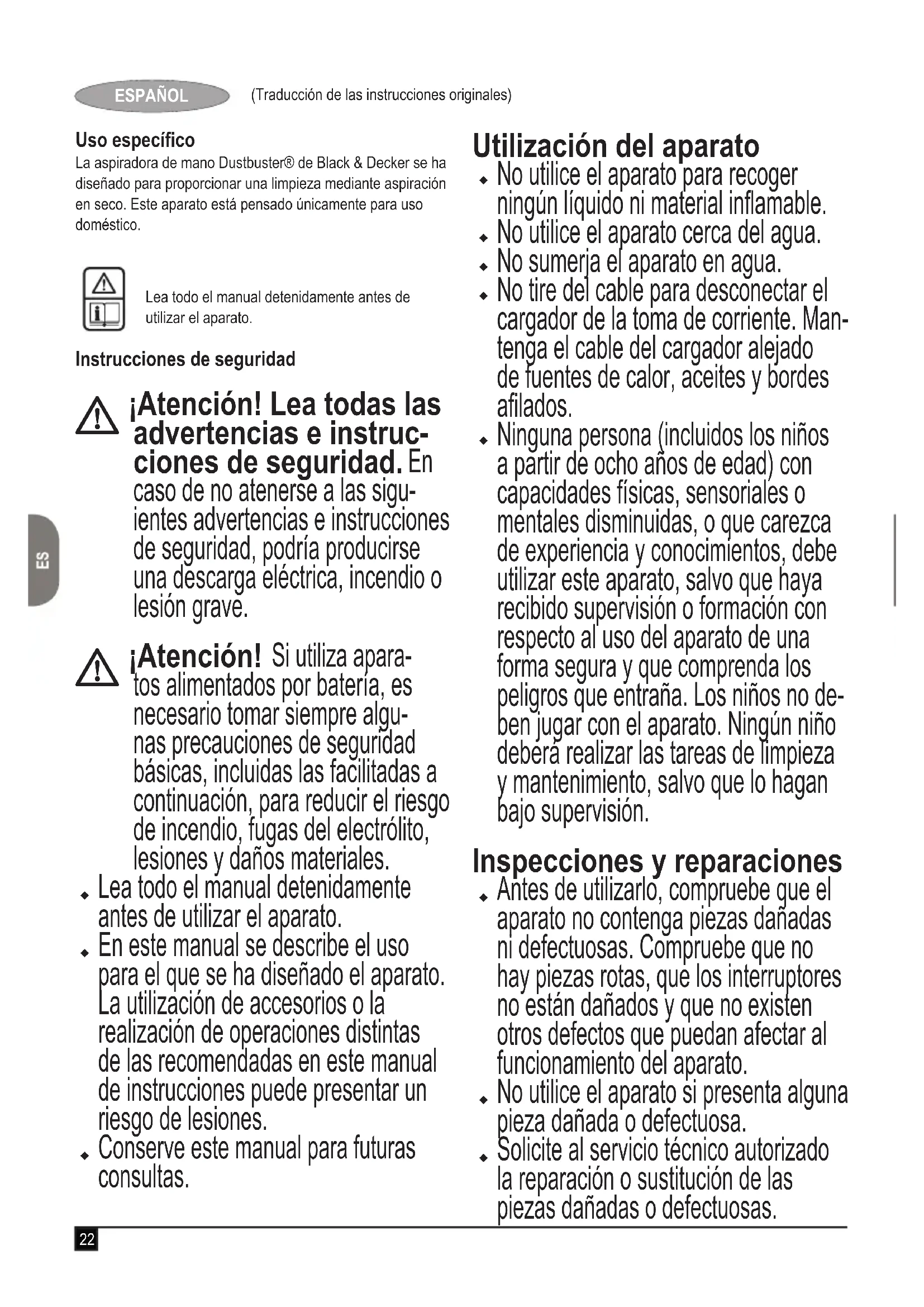 ¡Atención! Si utiliza apara- tos alimentados por batería, es necesario tomar siempre algu- nas precauciones de seguridad básicas, incluidas las facilitadas a continuación, para reducir el riesgo de incendio, fugas del electrólito, lesiones y daños materiales. Lea todo el manual detenidamente antes de utilizar el aparato. En este manual se describe el uso para el que se ha diseñado el aparato. La utilización de accesorios o la realización de operaciones distintas de las recomendadas en este manual de instrucciones puede presentar un riesgo de lesiones. Conserve este manual para futuras consultas. Utilización del aparato No utilice el aparato para recoger ningún líquido ni material inamable. No utilice el aparato cerca del agua. No sumerja el aparato en agua. No tire del cable para desconectar el cargador de la toma de corriente. Man- tenga el cable del cargador alejado de fuentes de calor, aceites y bordes alados. Ninguna persona (incluidos los niños a partir de ocho años de edad) con capacidades físicas, sensoriales o mentales disminuidas, o que carezca de experiencia y conocimientos, debe utilizar este aparato, salvo que haya recibido supervisión o formación con respecto al uso del aparato de una forma segura y que comprenda los peligros que entraña. Los niños no de- ben jugar con el aparato. Ningún niño deberá realizar las tareas de limpieza y mantenimiento, salvo que lo hagan bajo supervisión. Inspecciones y reparaciones Antes de utilizarlo, compruebe que el aparato no contenga piezas dañadas ni defectuosas. Compruebe que no hay piezas rotas, que los interruptores no están dañados y que no existen otros defectos que puedan afectar al funcionamiento del aparato. No utilice el aparato si presenta alguna pieza dañada o defectuosa. Solicite al servicio técnico autorizado la reparación o sustitución de las piezas dañadas o defectuosas.23 (Traducción de las instrucciones originales) ESPAÑOL Compruebe con regularidad que el ca- ble del cargador no ha sufrido daños. Sustituya el cargador si el cable está dañado o es defectuoso. Nunca intente extraer ni sustituir pie- zas no especicadas en este manual. Instrucciones de seguri- dad adicionales Después de la utilización Antes de limpiar el cargador o su base, desconéctelo. Cuando no lo utilice, el aparato se debe guardar en un lugar seco. Los niños no deben tener acceso a los aparatos guardados. Riesgos residuales. El uso de esta herramienta puede pro- ducir riesgos residuales adicionales no incluidos en las advertencias de seguri- dad adjuntas. Estos riesgos se pueden generar por un uso incorrecto, dema- siado prolongado, etc. El cumplimiento de las normas de seguridad correspondientes y el uso de dispositivos de seguridad no evitan ciertos riesgos residuales. Estos riesgos incluyen: Lesiones producidas por el contacto con piezas móviles o giratorias. Lesiones producidas al cambiar cualquier pieza, cuchilla o accesorio. Lesiones producidas al usar una her- ramienta por un tiempo demasiado prolongado. Si utiliza una herramienta durante períodos de tiempo demasia- do prolongados, asegúrese de realizar pausas con frecuencia. Discapacidad auditiva. Riesgos para la salud producidos al respirar el polvo que se genera al usar la herramienta (por ejemplo: en los trabajos con madera, especialmente de roble, haya y tableros de densidad mediana). Baterías y cargadores Baterías No intente abrirlas bajo ningún con- cepto. No exponga la batería al agua. No exponga la batería al calor. No guarde la batería en lugares en los que la temperatura pueda superar los 40 ºC. Realice la carga únicamente a una temperatura ambiente de entre 10 °C y 40 °C. Utilice únicamente el cargador sum- inistrado con el aparato. La utilización de un cargador incorrecto podría provocar una descarga eléctrica o el recalentamiento de la batería. Para desechar las pilas o las baterías, siga las instrucciones facilitadas en la sección “Protección del medio ambi- ente”.24 (Traducción de las instrucciones originales) ESPAÑOL No dañe ni deforme la batería medi- ante perforaciones o golpes, ya que puede suponer un riesgo de incendio y de lesiones. No cargue baterías dañadas. Es posible que se produzcan fugas en las baterías en condiciones extremas. Cuando observe que se producen fu- gas en las baterías, limpie cuidadosa- mente el líquido con un paño. Evite el contacto con la piel. En caso de que se produzca contacto con la piel o los ojos, siga las instruc- ciones facilitadas a continuación. ¡Atención! El líquido de las baterías puede provocar lesiones o daños ma- teriales. En caso de que se produzca contacto con la piel, lave la zona con agua inmediatamente. Si se produce enrojecimiento, dolor o irritación, solicite atención médica. En caso de contacto con los ojos, lave la zona inmediata- mente con agua limpia y solicite atención médica. Cargadores El cargador se ha diseñado para un voltaje especíco. Cada vez que utilice el aparato, debe comprobar que el voltaje de la red eléctrica coincide con el valor indicado en la placa de datos. ¡Atención! No intente sustituir el cargador por un enchufe convencional para la red eléctrica. Utilice únicamente el cargador Black & Decker para cargar la batería en el aparato con el que fue suministrado. Si intenta cargar otras baterías, estas podrían explotar y provocar lesiones y daños materiales. No intente cargar nunca baterías no recargables. Si se dañara el cable de alimentación, lo deberá sustituir el fabricante o un centro de asistencia técnica autorizado de Black & Decker para evitar cualqui- er situación de riesgo. No exponga el cargador al agua. No abra el cargador. No aplique ningún dispositivo para medir la resistencia del cargador. El aparato o la batería deben colo- carse en una zona correctamente ventilada durante la carga. Seguridad eléctrica Símbolos del cargador Lea todo el manual detenidamente antes de utilizar el aparato.