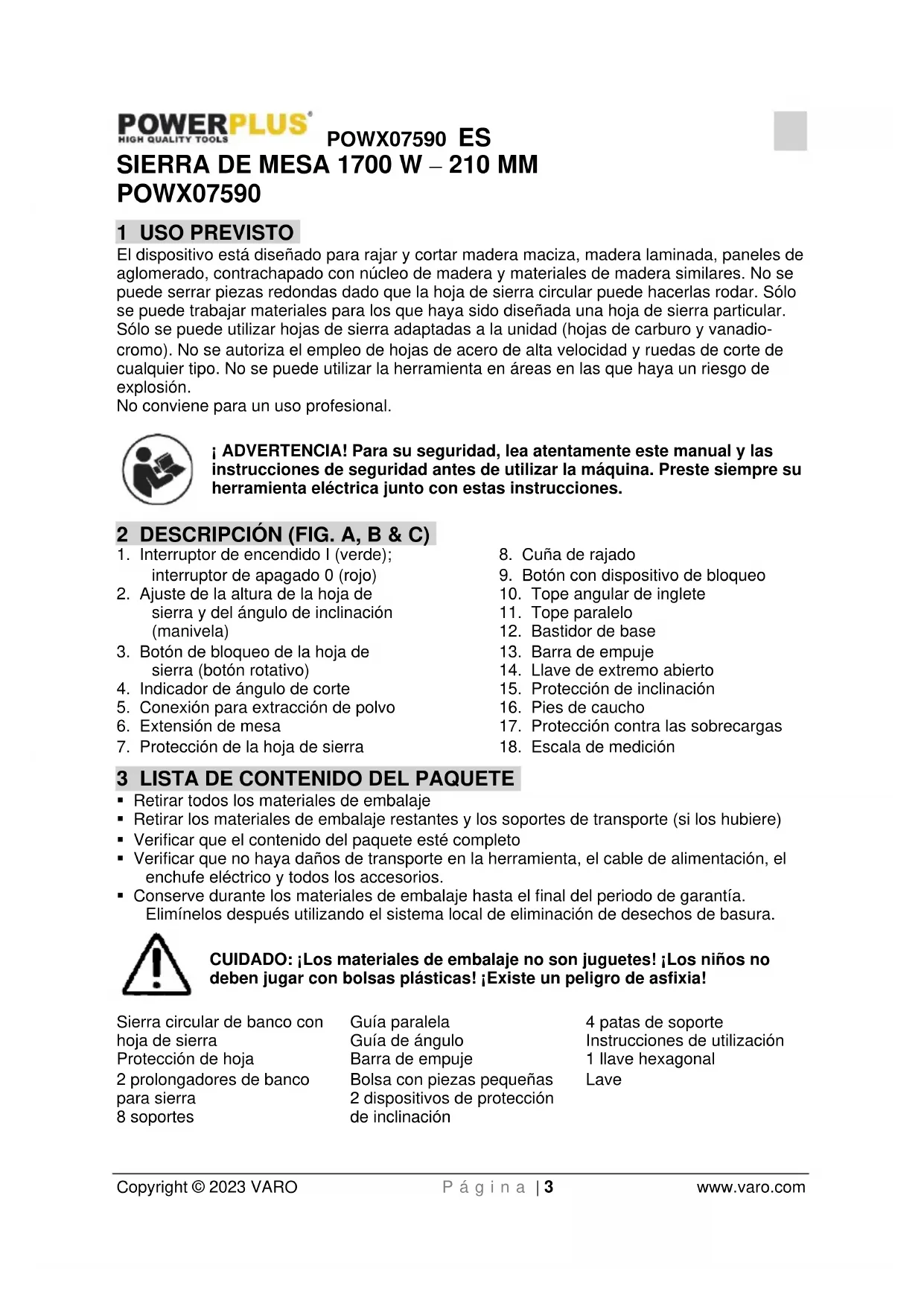 - No retire los trozos de material cortado mientras que la sierra esté en funcionamiento.POWX07590 ES Copyright © 2023 VARO P á g i n a | 7 www.varo.com