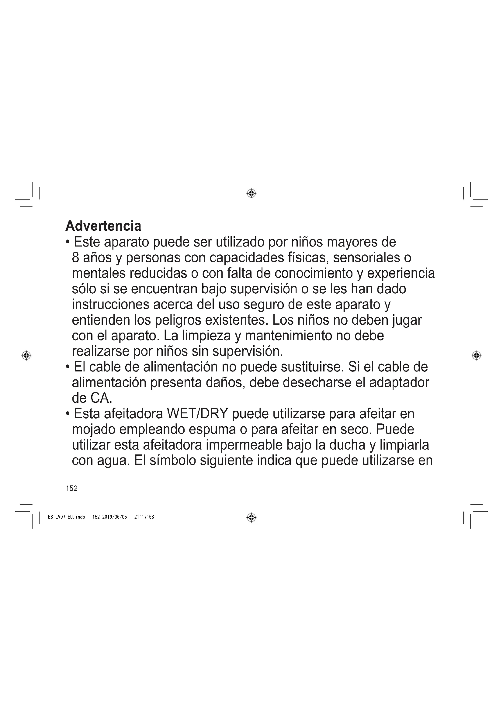 - Esta afeitadora WET/DRY puede utilizarse para afeitar en mojado empleando espuma o para afeitar en seco. Puede utilizar esta afeitadora impermeable bajo la ducha y limpiarla con agua. El símbolo siguiente indica que puede utilizarse en ES-LV97_EU.indb 152 2019/06/05 21:17:58153 TR RO H SK CZ PL FIN S N P DK E NL I F D GB una bañera o ducha.