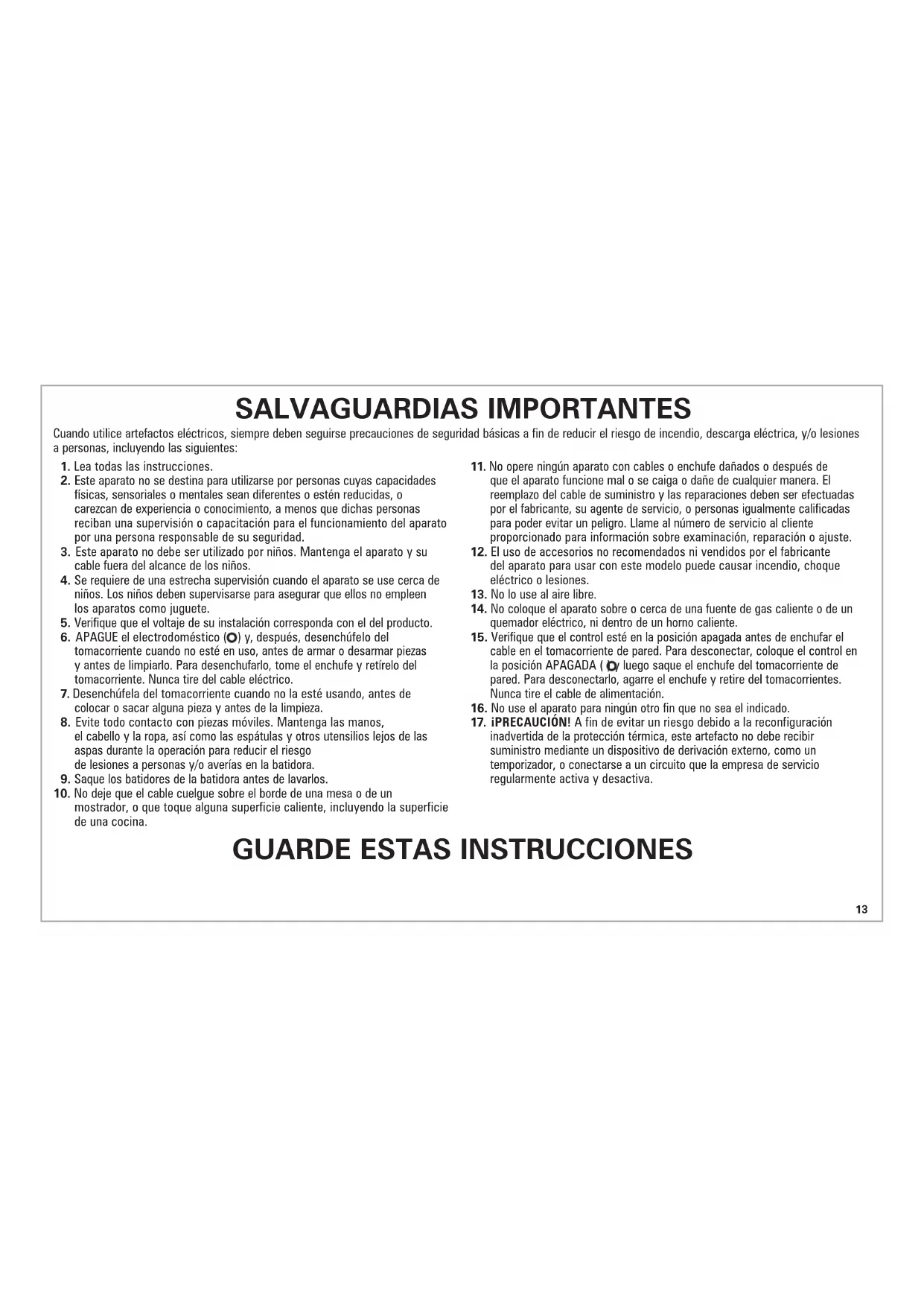 PRECAUCIÓN Desenchufe siempre la batidora antes de tratar de extraer los agitadores. Apriete el gatillo para expulsar los agitadores. Función de Ráfaga: Presione y sostenga el dial de velocidad para obtener potencia adicional en cualquier velocidad. Características Adicionales Caja de Almacenamiento: Para retirar la batidora de la caja, empuje la esquina de la caja hacia afuera sobre la abertura y gire la manija de la batidora en la posición opuesta. Bloqueo del Cable Giratorio: Gire el bloqueo del cable giratorio hacia la derecha o la izquierda hasta que encaje en su lugar. Para destrabar, gire el bloqueo del cable giratorio en dirección opuesta.17 La siguiente guía de mezclado es una sugerencia para seleccionar velocidades para batidoras de 7 velocidades. Comience en la velocidad 1 y suba hasta la velocidad deseada en base a la consistencia de la receta. Guía General de Mezclado Cómo Usar la Batidora de Mano (cont.) Cuidado y Limpieza w ADVERTENCIA Peligro de Descarga Eléctrica. Desconecte la energía antes de limpiar. No sumerja la mezcladora, cable o enchufe en ningún líquido.1. Siempre desenchufe la batidora del tomacorriente y expulse los accesorios antes de lavar.2. Los batidores de raspado suave, el accesorio batidor, los ganchos para amasar y los accesorios opcionales son aptos para lavavajillas o pueden lavarse en agua caliente jabonosa. Enjuague y seque.3. Limpie el cuerpo y el cable de la batidora con un paño limpio y húmedo.NOTA: No utilice esponjillas o productos de limpieza abrasivos. Para reducir el riesgo de descarga eléctrica, no sumerja en agua el cuerpo de la batidora en ningún momento. Resolviendo Problemas El motor funciona de forma muy lenta.• Demasiados ingredientes en el tazón. Retire algunos ingredientes y haga su reinicio.• El dial de velocidad está configurado en un nivel demasiado bajo. Configure el dial de velocidad en una velocidad más alta.El motor no se enciende.• En enchufe de corriente no está enchufado, o el interruptor de circuitos ha saltado. Enchufe en el tomacorriente y controle la función del tomacorriente.• La batidora de mano no está encendida. Mueva el dial de velocidad hasta la velocidad deseada.• El motor está dañado. Llame a nuestro departamento de servicio al cliente.Los batidores dejaron de girar. • Esta batidora cuenta con una característica de seguridad cuando detecta una carga pesada (no hay rotación). Para reconfigurar, gire la perilla de control a (apagado).• Demasiados ingredientes en el tazón. Retire algunos ingredientes y haga su reinicio.Guía de Mezclado de Galletas:• La masa de galletas es una de las masas más espesas para mezclar.• Utilice un tazón de mezclado grande para que los ingredientes puedan mezclarse más fácilmente.• Tenga la mantequilla o margarina a temperatura ambiente.• Agregue harina de a 1 taza (237 ml) por vez, mezclando bien después de cada taza.