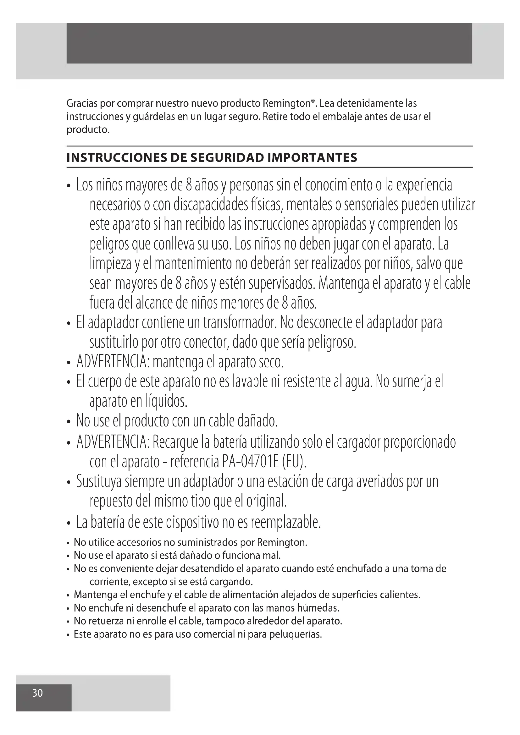 AE30 Gracias por comprar nuestro nuevo producto Remington®. Lea detenidamente las instrucciones y guárdelas en un lugar seguro. Retire todo el embalaje antes de usar el producto.