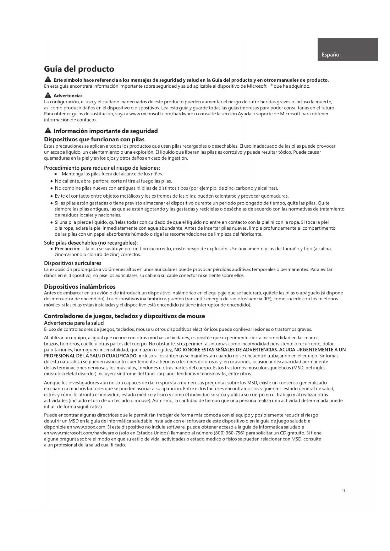 que ha adquirido. Advertencia: La confi guración, el uso y el cuidado inadecuados de este producto pueden aumentar el riesgo de sufrir heridas graves o incluso la muerte, así como producir daños en el dispositivo o dispositivos. Lea esta guía y guarde todas las guías impresas para poder consultarlas en el futuro. Para obtener guías de sustitución, vaya a www.microsoft.com/hardware o consulte la sección Ayuda o soporte de Microsoft para obtener información de contacto. Información importante de seguridad Dispositivos que funcionan con pilas Estas precauciones se aplican a todos los productos que usan pilas recargables o desechables. El uso inadecuado de las pilas puede provocar un escape líquido, un calentamiento o una explosión. El líquido que liberan las pilas es corrosivo y puede resultar tóxico. Puede causar quemaduras en la piel y en los ojos y otros daños en caso de ingestión. Procedimiento para reducir el riesgo de lesiones: ● Mantenga las pilas fuera del alcance de los niños. ● No caliente, abra, perfore, corte ni tire al fuego las pilas. ● No combine pilas nuevas con antiguas ni pilas de distintos tipos (por ejemplo, de zinc-carbono y alcalinas). ● Evite el contacto entre objetos metálicos y los extremos de las pilas; pueden calentarse y provocar quemaduras. ● Si las pilas están gastadas o tiene previsto almacenar el dispositivo durante un período prolongado de tiempo, quite las pilas. Quite siempre las pilas antiguas, las que se estén agotando y las gastadas y recíclelas o deséchelas de acuerdo con las normativas de tratamiento de residuos locales y nacionales. ● Si una pila pierde líquido, quítelas todas con cuidado de que el líquido no entre en contacto con la piel ni con la ropa. Si toca la piel o la ropa, aclare la piel inmediatamente con agua abundante. Antes de insertar pilas nuevas, limpie profundamente el compartimento de las pilas con un papel absorbente húmedo o siga las recomendaciones de limpieza del fabricante. Solo pilas desechables (no recargables): ● Precaución: si la pila se sustituye por un tipo incorrecto, existe riesgo de explosión. Use únicamente pilas del tamaño y tipo (alcalina, zinc-carbono o cloruro de zinc) correctos. Dispositivos auriculares La exposición prolongada a volúmenes altos en unos auriculares puede provocar pérdidas auditivas temporales o permanentes. Para evitar daños en el dispositivo, no pise los auriculares, su cable o su cable conector ni se siente sobre ellos. Dispositivos inalámbricos Antes de embarcar en un avión o de introducir un dispositivo inalámbrico en el equipaje que se facturará, quítele las pilas o apáguelo (si dispone de interruptor de encendido). Los dispositivos inalámbricos pueden transmitir energía de radiofrecuencia (RF), como sucede con los teléfonos móviles, si las pilas están instaladas y el dispositivo está encendido (si tiene interruptor de encendido). Controladores de juegos, teclados y dispositivos de mouse Advertencia para la salud El uso de controladores de juegos, teclados, mouse u otros dispositivos electrónicos puede conllevar lesiones o trastornos graves. Al utilizar un equipo, al igual que ocurre con otras muchas actividades, es posible que experimente cierta incomodidad en las manos, brazos, hombros, cuello u otras partes del cuerpo. No obstante, si experimenta síntomas como incomodidad persistente o recurrente, dolor, palpitaciones, hormigueo, insensibilidad, quemazón o rigidez, NO IGNORE ESTAS SEÑALES DE ADVERTENCIAS. ACUDA URGENTEMENTE A UN PROFESIONAL DE LA SALUD CUALIFICADO, incluso si los síntomas se manifi estan cuando no se encuentre trabajando en el equipo. Síntomas de esta naturaleza se pueden asociar frecuentemente a heridas o lesiones dolorosas y, en ocasiones, ocasionar discapacidad permanente de las terminaciones nerviosas, los músculos, tendones u otras partes del cuerpo. Estos trastornos musculoesqueléticos (MSD, del inglés musculoskeletal disorder) incluyen: síndrome del túnel carpiano, tendinitis y tenosinovitis, entre otros. Aunque los investigadores aún no son capaces de dar respuesta a numerosas preguntas sobre los MSD, existe un consenso generalizado en cuanto a muchos factores que se pueden asociar a su aparición. Entre estos factores encontramos los siguientes: estado general de salud, estrés y cómo lo afronta el individuo, estado médico y físico y cómo el individuo se sitúa y utiliza su cuerpo en el trabajo y al realizar otras actividades (incluido el uso de un teclado o mouse). Asimismo, la cantidad de tiempo que una persona realiza una actividad determinada puede infl uir de forma signifi cativa. Puede encontrar algunas directrices que le permitirán trabajar de forma más cómoda con el equipo y posiblemente reducir el riesgo de sufrir un MSD en la guía de informática saludable instalada con el software de este dispositivo o en la guía de juego saludable disponible en www.xbox.com. Si este dispositivo no incluía software, puede obtener acceso a la guía de informática saludable en www.microsoft.com/hardware o (solo en Estados Unidos) llamando al número (800) 360-7561 para solicitar un CD gratuito. Si tiene alguna pregunta sobre el modo en que su estilo de vida, actividades o estado médico o físico se pueden relacionar con MSD, consulte a un profesional de la salud cualifi cado. Español14 Ataques de epilepsia fotosensible Un porcentaje reducido de la población puede sufrir un ataque al exponerse a ciertas imágenes visuales, como luces parpadeantes o patrones que pueden aparecer en los videojuegos. Incluso aquellas personas que no presenten un historial clínico de ataques o epilepsia pueden padecer una afección no diagnosticada que conlleve “ataques de epilepsia fotosensible” al utilizar videojuegos. Estos ataques pueden presentar una amplia variedad de síntomas, entre los que se incluyen ligero dolor de cabeza, alteración de la visión, tics oculares o faciales, sacudidas o temblo