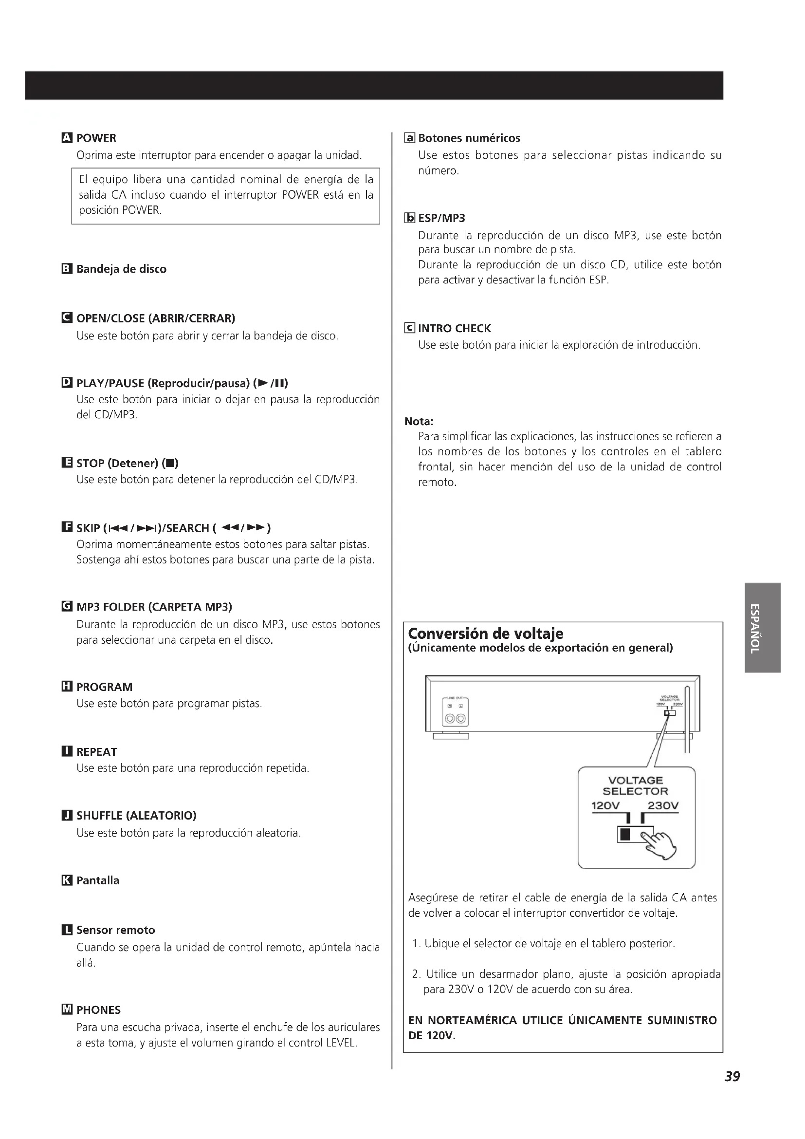 Botones numéricos Use estos botones para seleccionar pistas indicando su número. ESP/MP3 Durante la reproducción de un disco MP3, use este botón para buscar un nombre de pista. Durante la reproducción de un disco CD, utilice este botón para activar y desactivar la función ESP. INTRO CHECK Use este botón para iniciar la exploración de introducción. Nota: Para simplificar las explicaciones, las instrucciones se refieren a los nombres de los botones y los controles en el tablero frontal, sin hacer mención del uso de la unidad de control remoto.