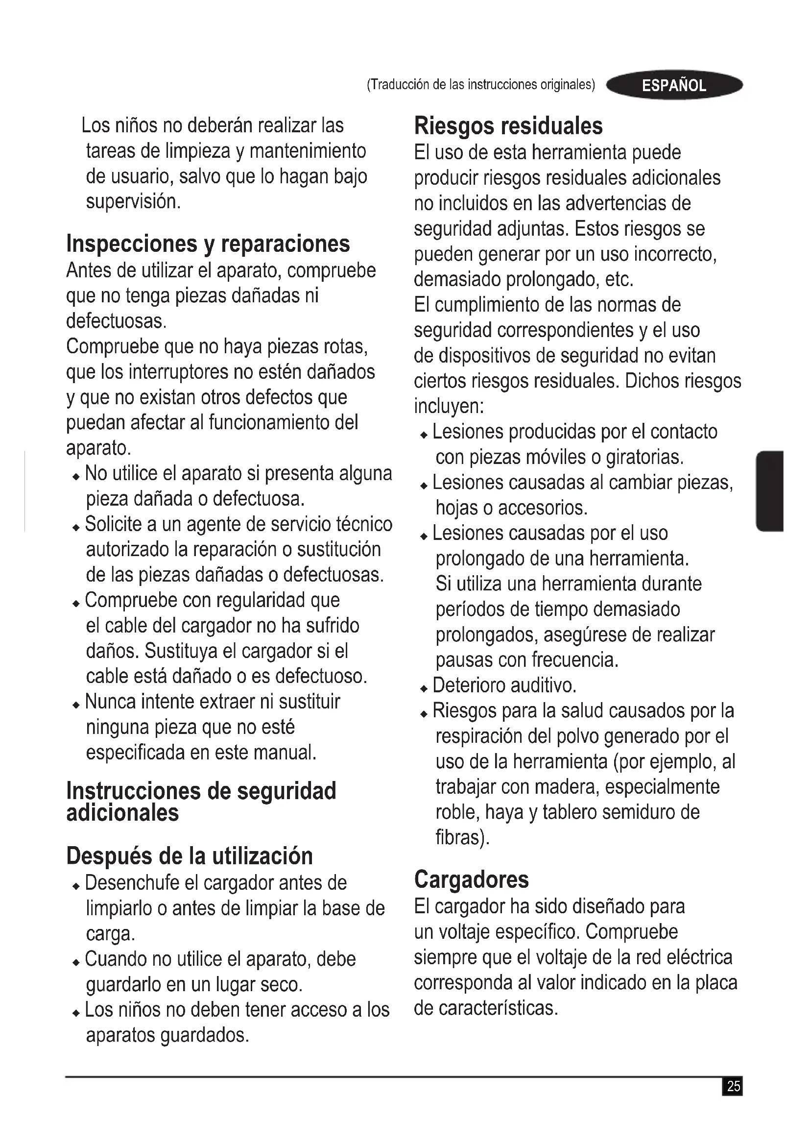 Advertencia. Lea todas las advertencias de seguridad y todas las instrucciones. En caso de no atenerse a las siguientes advertencias e instrucciones de seguridad, podría producirse una descarga eléctrica, incendio o lesión grave. u En este manual se describe el uso previsto del aparato. La utilización de accesorios o acoplamientos y la realización de operaciones distintas a las recomendadas en este manual de instrucciones con este aparato pueden conllevar un riesgo de lesiones. u Conserve este manual para futuras consultas. Uso del aparato u No utilice el aparato para recoger líquidos o materiales inamables. u No utilice el aparato cerca del agua. u No sumerja el aparato en agua. u No tire del cable para desconectar el cargador de la toma de corriente. Mantenga el cable del cargador alejado de fuentes de calor, aceites y bordes alados. u Este aparato puede ser usado por niños a partir de 8 años de edad y por personas con capacidades físicas, sensoriales o mentales disminuidas, o que carezcan de experiencia y conocimientos, si están supervisadas o han recibido formación con respecto al uso del aparato de una forma segura y que comprenden los peligros que entraña su uso. Los niños no deben jugar con el aparato.25 (Traducción de las instrucciones originales) ESPAÑOL Los niños no deberán realizar las tareas de limpieza y mantenimiento de usuario, salvo que lo hagan bajo supervisión. Inspecciones y reparaciones Antes de utilizar el aparato, compruebe que no tenga piezas dañadas ni defectuosas. Compruebe que no haya piezas rotas, que los interruptores no estén dañados y que no existan otros defectos que puedan afectar al funcionamiento del aparato. u No utilice el aparato si presenta alguna pieza dañada o defectuosa. u Solicite a un agente de servicio técnico autorizado la reparación o sustitución de las piezas dañadas o defectuosas. u Compruebe con regularidad que el cable del cargador no ha sufrido daños. Sustituya el cargador si el cable está dañado o es defectuoso. u Nunca intente extraer ni sustituir ninguna pieza que no esté especicada en este manual. Instrucciones de seguridad adicionales Después de la utilización u Desenchufe el cargador antes de limpiarlo o antes de limpiar la base de carga. u Cuando no utilice el aparato, debe guardarlo en un lugar seco. u Los niños no deben tener acceso a los aparatos guardados. Riesgos residuales El uso de esta herramienta puede producir riesgos residuales adicionales no incluidos en las advertencias de seguridad adjuntas. Estos riesgos se pueden generar por un uso incorrecto, demasiado prolongado, etc. El cumplimiento de las normas de seguridad correspondientes y el uso de dispositivos de seguridad no evitan ciertos riesgos residuales. Dichos riesgos incluyen: u Lesiones producidas por el contacto con piezas móviles o giratorias. u Lesiones causadas al cambiar piezas, hojas o accesorios. u Lesiones causadas por el uso prolongado de una herramienta. Si utiliza una herramienta durante períodos de tiempo demasiado prolongados, asegúrese de realizar pausas con frecuencia. u Deterioro auditivo.u Riesgos para la salud causados por la respiración del polvo generado por el uso de la herramienta (por ejemplo, al trabajar con madera, especialmente roble, haya y tablero semiduro de bras). Cargadores El cargador ha sido diseñado para un voltaje especíco. Compruebe siempre que el voltaje de la red eléctrica corresponda al valor indicado en la placa de características.26 (Traducción de las instrucciones originales)ESPAÑOL Advertencia. No intente sustituir el cargador por un enchufe convencional para la red eléctrica. u Solo debe utilizar el cargador BLACK+DECKER suministrado para cargar la batería del aparato. Otras baterías podrían explotar y provocar lesiones y daños materiales. u Nunca intente cargar baterías no recargables. u Si se daña el cable de alimentación, el fabricante o un centro de servicio técnico autorizado de BLACK+DECKER deberán sustituirlo para evitar riesgos. u No exponga el cargador al agua.u No abra el cargador.u No aplique ningún dispositivo para medir la resistencia del cargador. u Durante la carga, el aparato/ batería debe colocarse en una zona correctamente ventilada. Seguridad eléctrica Símbolos del cargador Lea todo el manual detenidamente antes de utilizar el aparato.