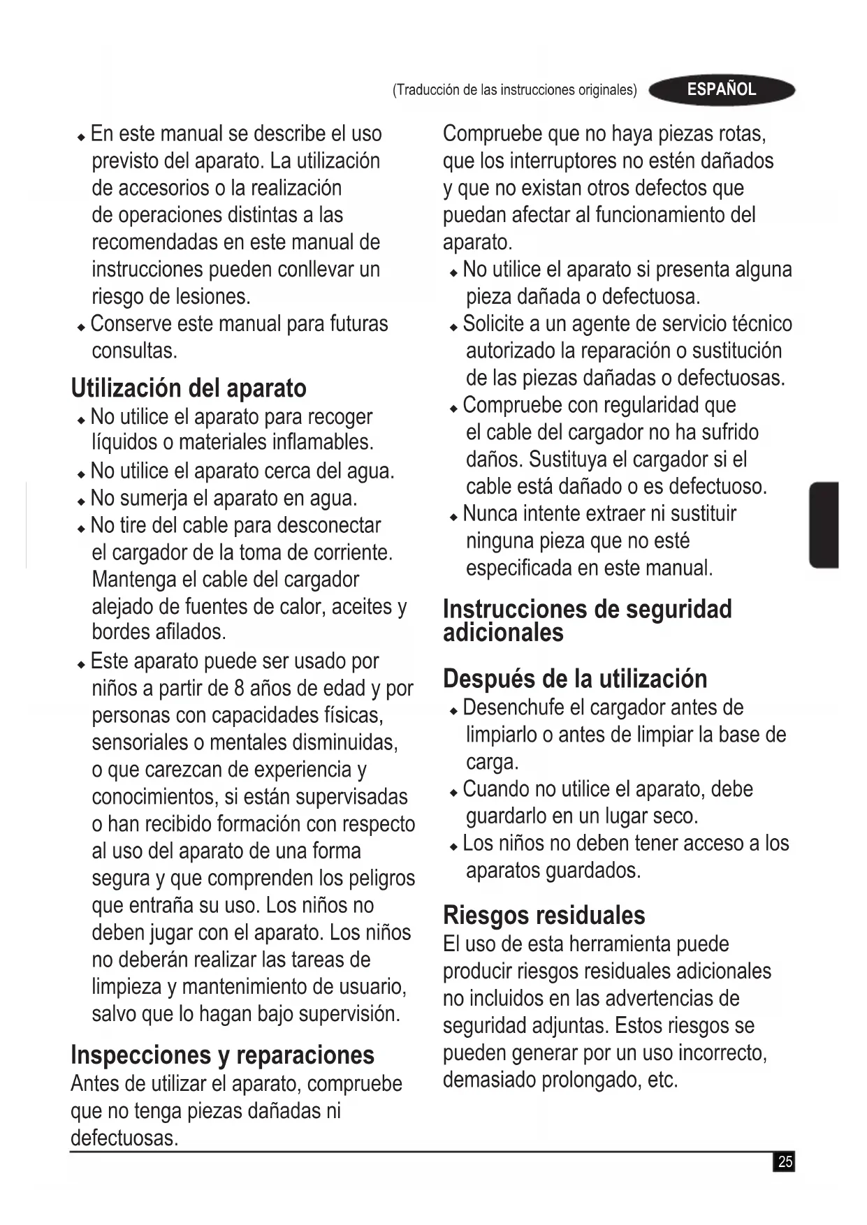 Advertencia. Lea todas las advertencias de seguridad y todas las instrucciones. En caso de no atenerse a las siguientes advertencias e instrucciones de seguridad, podría producirse una descarga eléctrica, incendio o lesión grave. (Traducción de las instrucciones originales)ESPAÑOL25 (Traducción de las instrucciones originales) ESPAÑOL u En este manual se describe el uso previsto del aparato. La utilización de accesorios o la realización de operaciones distintas a las recomendadas en este manual de instrucciones pueden conllevar un riesgo de lesiones. u Conserve este manual para futuras consultas. Utilización del aparato u No utilice el aparato para recoger líquidos o materiales inamables. u No utilice el aparato cerca del agua.u No sumerja el aparato en agua.u No tire del cable para desconectar el cargador de la toma de corriente. Mantenga el cable del cargador alejado de fuentes de calor, aceites y bordes alados. u Este aparato puede ser usado por niños a partir de 8 años de edad y por personas con capacidades físicas, sensoriales o mentales disminuidas, o que carezcan de experiencia y conocimientos, si están supervisadas o han recibido formación con respecto al uso del aparato de una forma segura y que comprenden los peligros que entraña su uso. Los niños no deben jugar con el aparato. Los niños no deberán realizar las tareas de limpieza y mantenimiento de usuario, salvo que lo hagan bajo supervisión. Inspecciones y reparaciones Antes de utilizar el aparato, compruebe que no tenga piezas dañadas ni defectuosas. Compruebe que no haya piezas rotas, que los interruptores no estén dañados y que no existan otros defectos que puedan afectar al funcionamiento del aparato. u No utilice el aparato si presenta alguna pieza dañada o defectuosa. u Solicite a un agente de servicio técnico autorizado la reparación o sustitución de las piezas dañadas o defectuosas. u Compruebe con regularidad que el cable del cargador no ha sufrido daños. Sustituya el cargador si el cable está dañado o es defectuoso. u Nunca intente extraer ni sustituir ninguna pieza que no esté especicada en este manual. Instrucciones de seguridad adicionales Después de la utilización u Desenchufe el cargador antes de limpiarlo o antes de limpiar la base de carga. u Cuando no utilice el aparato, debe guardarlo en un lugar seco. u Los niños no deben tener acceso a los aparatos guardados. Riesgos residuales El uso de esta herramienta puede producir riesgos residuales adicionales no incluidos en las advertencias de seguridad adjuntas. Estos riesgos se pueden generar por un uso incorrecto, demasiado prolongado, etc.26 (Traducción de las instrucciones originales)ESPAÑOL El cumplimiento de las normas de seguridad correspondientes y el uso de dispositivos de seguridad no evitan ciertos riesgos residuales. Dichos riesgos incluyen: u Lesiones producidas por el contacto con piezas móviles o giratorias. u Lesiones causadas al cambiar piezas, hojas o accesorios. u Lesiones causadas por el uso prolongado de una herramienta. Si utiliza una herramienta durante períodos de tiempo demasiado prolongados, asegúrese de realizar pausas con frecuencia. u Deterioro auditivo.u Riesgos para la salud causados por la respiración del polvo generado por el uso de la herramienta (por ejemplo, al trabajar con madera, especialmente roble, haya, tablero semiduro de bras y cuarzo en polvo de hormigón). Cargadores El cargador ha sido diseñado para un voltaje especíco. Compruebe siempre que el voltaje de la red eléctrica corresponda al valor indicado en la placa de características. Advertencia. No intente sustituir el cargador por un enchufe convencional para la red eléctrica. u Solo debe utilizar el cargador BLACK+DECKER suministrado para cargar la batería del aparato. Otras baterías podrían explotar y provocar lesiones y daños materiales. u Nunca intente cargar baterías no recargables. u Si se daña el cable de alimentación, el fabricante o un centro de servicio técnico autorizado de BLACK+DECKER deberán sustituirlo para evitar riesgos. u No exponga el cargador al agua.u No abra el cargador.u No aplique ningún dispositivo para medir la resistencia del cargador. u Durante la carga, el aparato/ batería debe colocarse en una zona correctamente ventilada. Seguridad eléctrica Símbolos del cargador Lea todo el manual detenidamente antes de utilizar el aparato.