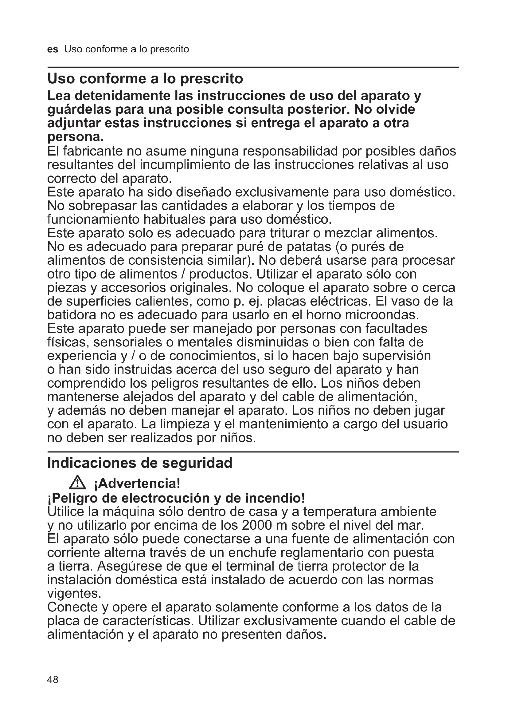 hdot saat myyntiliikkeeltä, josta olet ostanut laitteen. Takuutapauksessa on näytettävä ostokuitti. Oikeus muutoksiin pidätetään.48 es Uso conforme a lo prescrito Uso conforme a lo prescrito Lea detenidamente las instrucciones de uso del aparato y guárdelas para una posible consulta posterior. No olvide adjuntar estas instrucciones si entrega el aparato a otra persona. El fabricante no asume ninguna responsabilidad por posibles daños resultantes del incumplimiento de las instrucciones relativas al uso correcto del aparato. Este aparato ha sido diseñado exclusivamente para uso doméstico. No sobrepasar las cantidades a elaborar y los tiempos de funcionamiento habituales para uso doméstico. Este aparato solo es adecuado para triturar o mezclar alimentos. No es adecuado para preparar puré de patatas (o purés de alimentos de consistencia similar). No deberá usarse para procesar otro tipo de alimentos / productos. Utilizar el aparato sólo con piezas y accesorios originales. No coloque el aparato sobre o cerca de superficies calientes, como p. ej. placas eléctricas. El vaso de la batidora no es adecuado para usarlo en el horno microondas. Este aparato puede ser manejado por personas con facultades físicas, sensoriales o mentales disminuidas o bien con falta de experiencia y / o de conocimientos, si lo hacen bajo supervisión o han sido instruidas acerca del uso seguro del aparato y han comprendido los peligros resultantes de ello. Los niños deben mantenerse alejados del aparato y del cable de alimentación, y además no deben manejar el aparato. Los niños no deben jugar con el aparato. La limpieza y el mantenimiento a cargo del usuario no deben ser realizados por niños. Indicaciones de seguridad W ¡Advertencia! ¡Peligro de electrocución y de incendio! Utilice la máquina sólo dentro de casa y a temperatura ambiente y no utilizarlo por encima de los 2000 m sobre el nivel del mar. El aparato sólo puede conectarse a una fuente de alimentación con corriente alterna través de un enchufe reglamentario con puesta a tierra. Asegúrese de que el terminal de tierra protector de la instalación doméstica está instalado de acuerdo con las normas vigentes. Conecte y opere el aparato solamente conforme a los datos de la placa de características. Utilizar exclusivamente cuando el cable de alimentación y el aparato no presenten daños.49