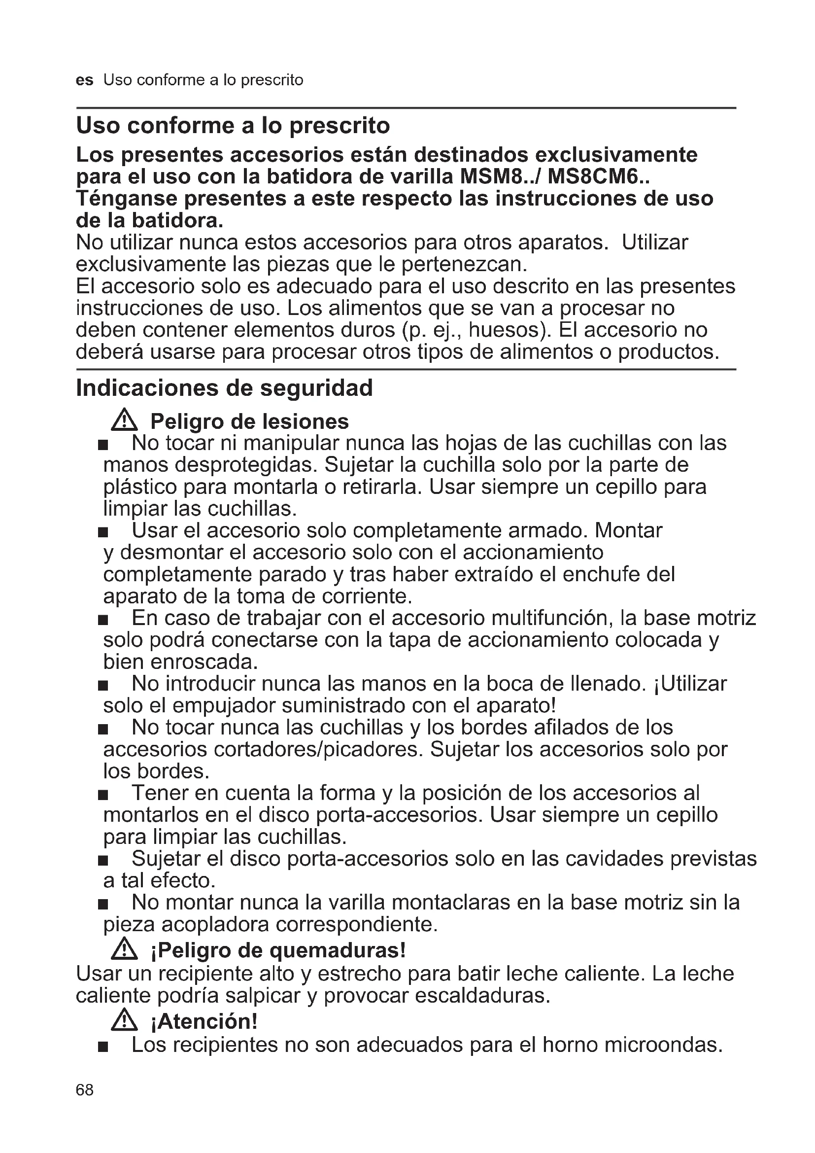 - según modelo Antes de usar el aparato por primera vez Antes de utilizar el accesorio por primera vez, desembalarlo completamente, limpiarlo y comprobarlo. ¡Atención! ¡No poner nunca en funcionamiento un accesorio dañado! ■ Extraer todos los accesorios del embalaje y retirar el material de embalaje. ■ Comprobar que estén todas las piezas y que no haya daños visibles. X Figura A ■ Limpiar y secar bien todas las piezas antes del primer uso. X «Limpieza y cuidado» véase la página 74 Leer las presentes instrucciones de uso detenidamente antes de utilizar el aparato. En ellas se facilitan importantes advertencias de seguridad y de manejo. Guardar las instrucciones de uso. En caso de entregar el aparato a otra persona, acompañarlo siempre de las correspondientes instrucciones de uso. Descripción del aparato X Figura A 1 Picador universal L * a Recipiente b Cuchilla universal (L) c Cuchilla para picar hielo (L) d Tapa de accionamiento e Tapa 2 Picador universal XL * a Recipiente b Cuchilla universal (XL) c Tapa de accionamiento d Tapa 3 Accesorio multifunción a Recipiente b Garfio amasador c Cuchilla universal d Tapa con pieza acopladora e Empujador f Disco porta-accesorios para accesorios cortadores y ralladores70 es Símbolos y marcas Símbolos y marcas Símbolo Significado