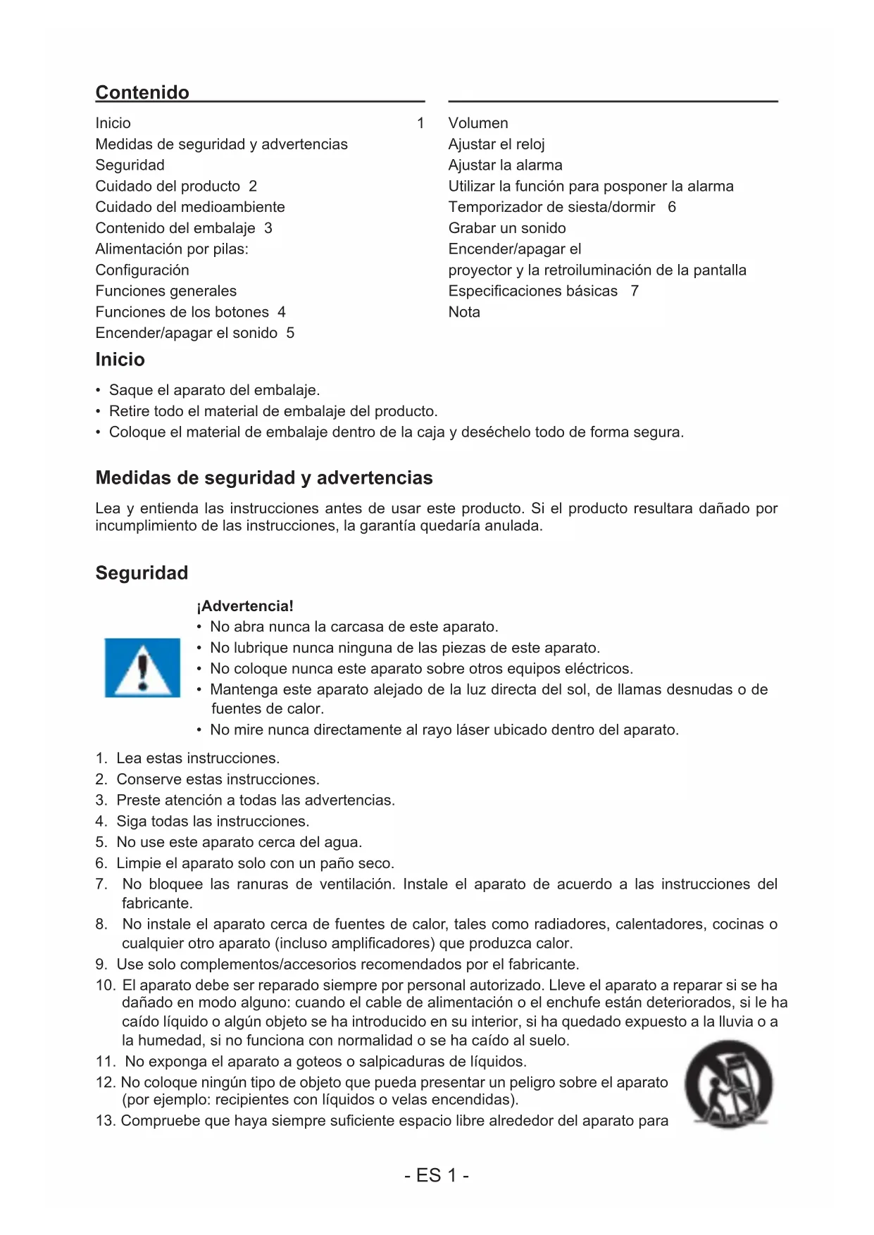 LEROGAMOSQUELEAÍNTEGRAMENTEELPRESENTEMANUAL DEL USUARIO ANTES DE UTILIZAR EL EQUIPO Y QUE CONSERVE ESTE FOLLETO PARA PODER CONSULTARLO EN EL FUTURO. ES- ES 1 - Contenido Inicio 1 Medidas de seguridad y advertencias Seguridad Cuidado del producto 2 Cuidado del medioambiente Contenido del embalaje 3 Alimentaciónporpilas: Conguración Funciones generales Funciones de los botones 4 Encender/apagar el sonido 5 Volumen Ajustar el reloj Ajustar la alarma Utilizar la función para posponer la alarma Temporizador de siesta/dormir 6 Grabarunsonido Encender/apagar el proyector y la retroiluminación de la pantalla Especicacionesbásicas 7 Nota Inicio