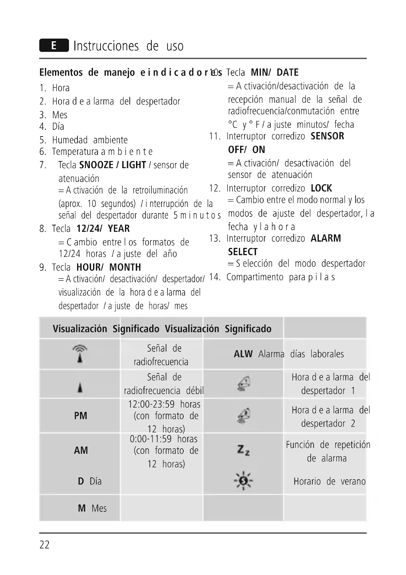 =Activación/ desactivación/ despertador/ visualización de la horadealarma del despertador /ajuste de horas/ mes