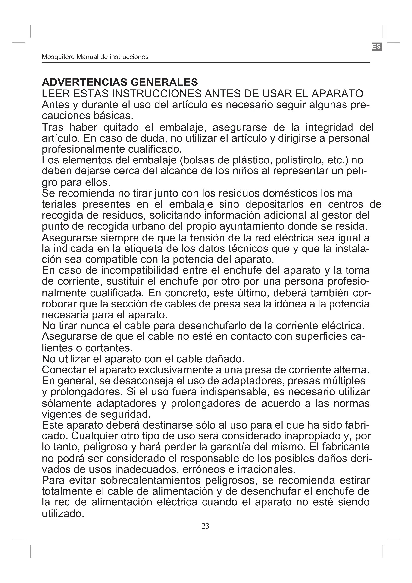 No ponga el mosquitero cerca de cortinas, duchas, piscinas y ambientes muy humedos; tampoco cerca de fuentes de calor de más de 50°. No deje el aparato expuesto a agentes atmosféricos (lluvia, sol, etc.)