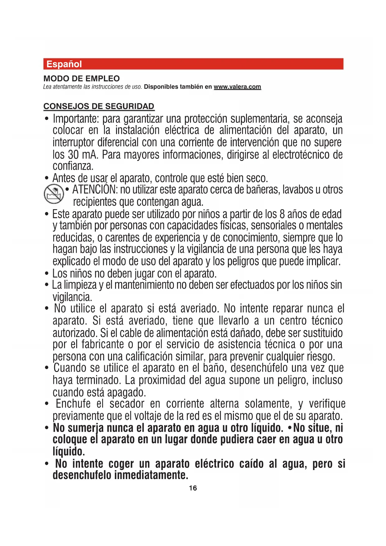 reparado por personas no autorizadas. En caso de avería, se debe entregar el aparato bien embalado y con el certificado de garantía regularmente fechado y sellado por el vendedor, a uno de nuestros Centros de Asistencia autorizados o al vendedor, quien se encargará de remitirlo al importador oficial para efectuar la reparación de la garantía. Como consumidor de ete artículo, goza Vd. de los derechos que le reconoce la Ley de Garantías en la Venta de Bienes de Consumo 23/2003 (B.O.E. 11-07-03), en las condiciones que la misma establece. Recuerde que la fecha acreditada mediante el documento de compra, inicia el período de dos años previsto en la Ley. El fabricante además amplía el periodo de garantía establecida por la legislación vigente hasta un máximo de 36 meses para la gama de secadores de cabello. Hasta un máximo de 60 meses únicamente para el motor de los secadores con motores AC. Esta garantía es válida solamente para el uso doméstico. Para el uso profesional o análogo la garantía es de 12 meses en todos los modelos. IMPORTANTE Los secadores de cabello enumerados en esta norma de uso NO son adecuados para la instalación y el uso en estructuras públicas, gimnasios, wellness/fitness, clubes, spa, etc. con alta concurrencia. Para la instalación y el uso en pequeñas instalaciones públicas, gimnasios, wellness/fitness, clubes, spa, etc. con baja concurrencia, Valera recomienda exclusivamente los siguientes modelos: SN9000 P • 583.11/P • 584.02/IP. VALERA es una marca registrada de Ligo Electric S.A. - Suiza19 Nederlands GEBRUIKSAANWIJZING Lees aandachtig deze gebruiksaanwijzing vooraleer de haardroger te gebruiken. Ook beschikbaar op www.valera.com VEILIGHEIDSVOORSCHRIFTEN