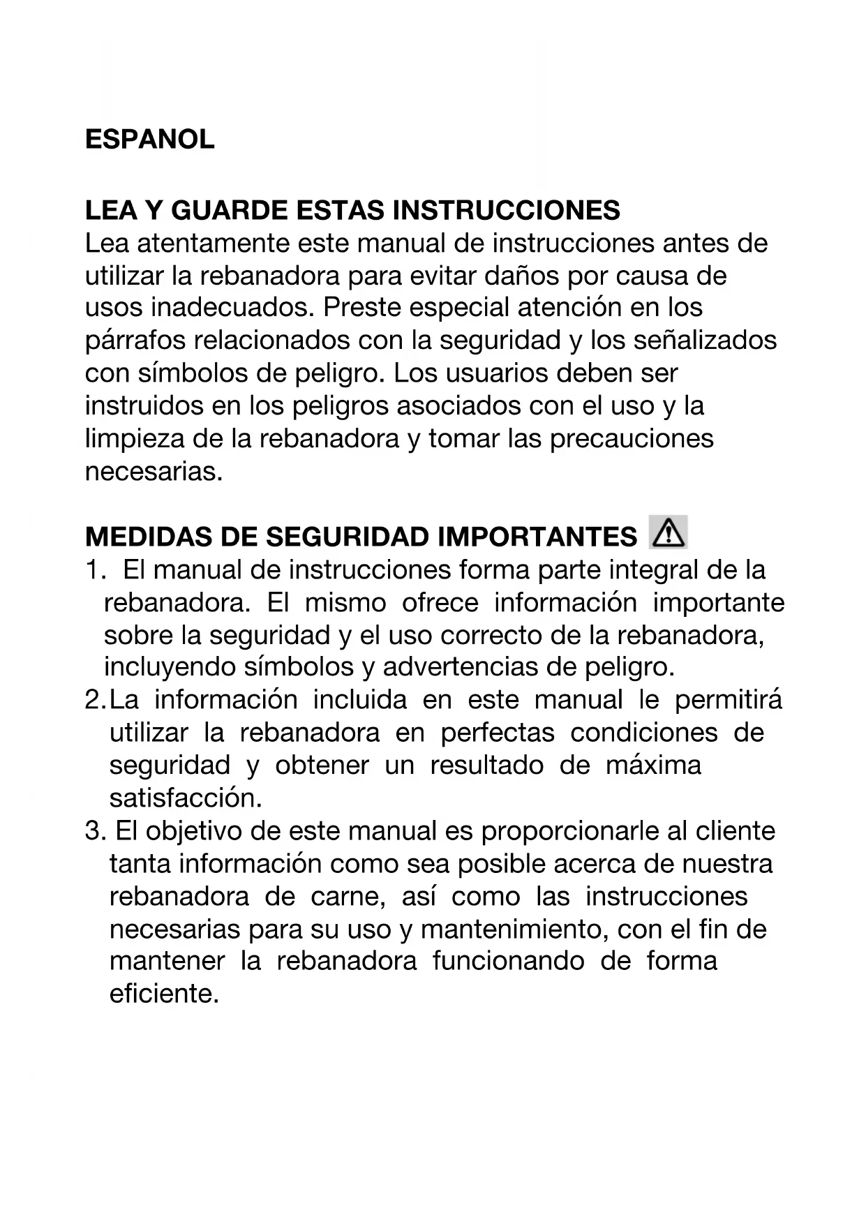 Lea atentamente este manual de instrucciones antes de utilizar la rebanadora para evaporar daños por causa de usos inadequados. Preste especial atencion en los párrafos relacionados con la seguridad y los signaalizados convinculos de peligro. Los usuario deben ser instruidos en los peligros asociados con el uso y la limpieza de la rebanadora yayar las precauiones necessarias.