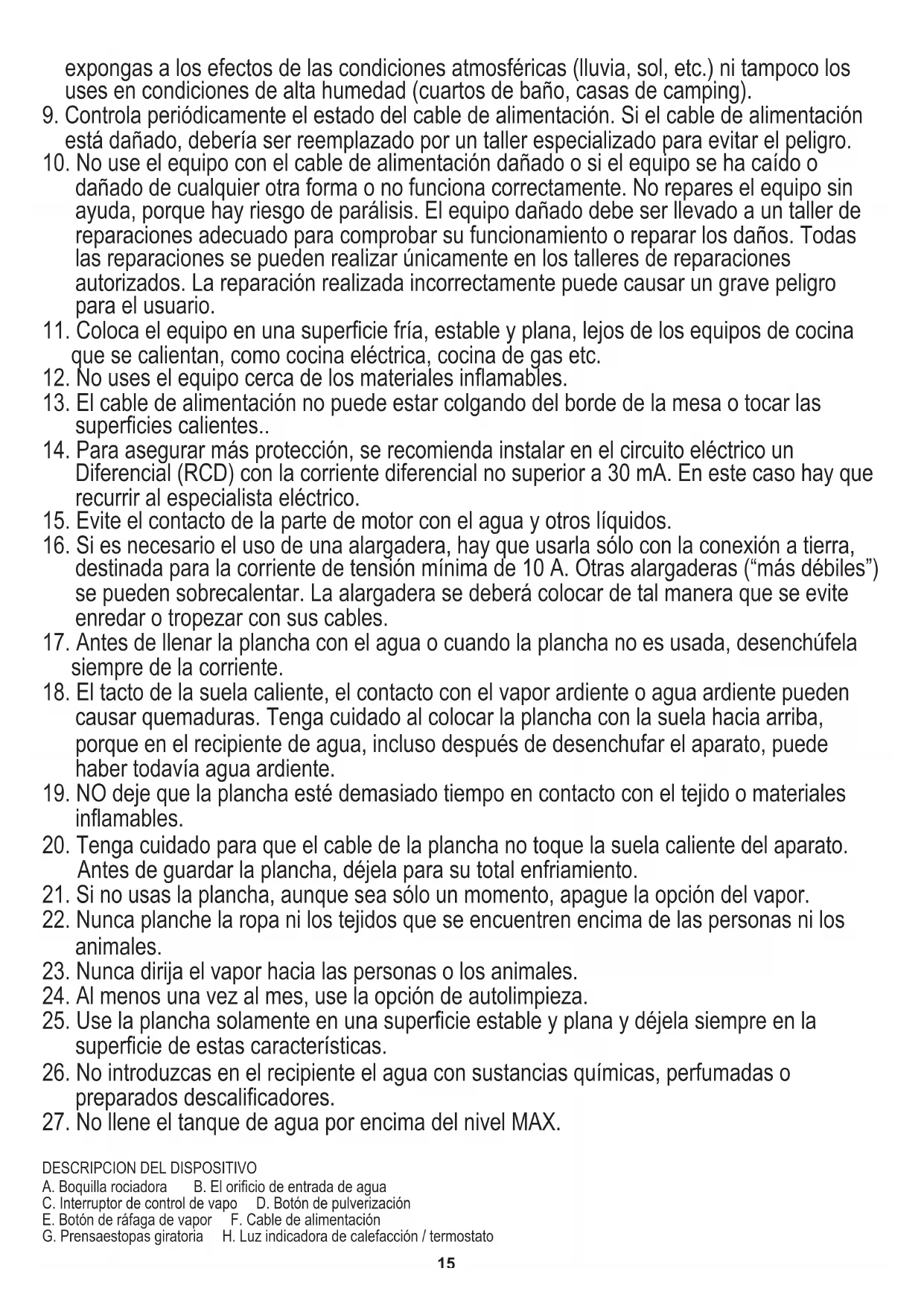 17. Antes de llenar la plancha con el agua o cuando la plancha no es usada, desenchúfela