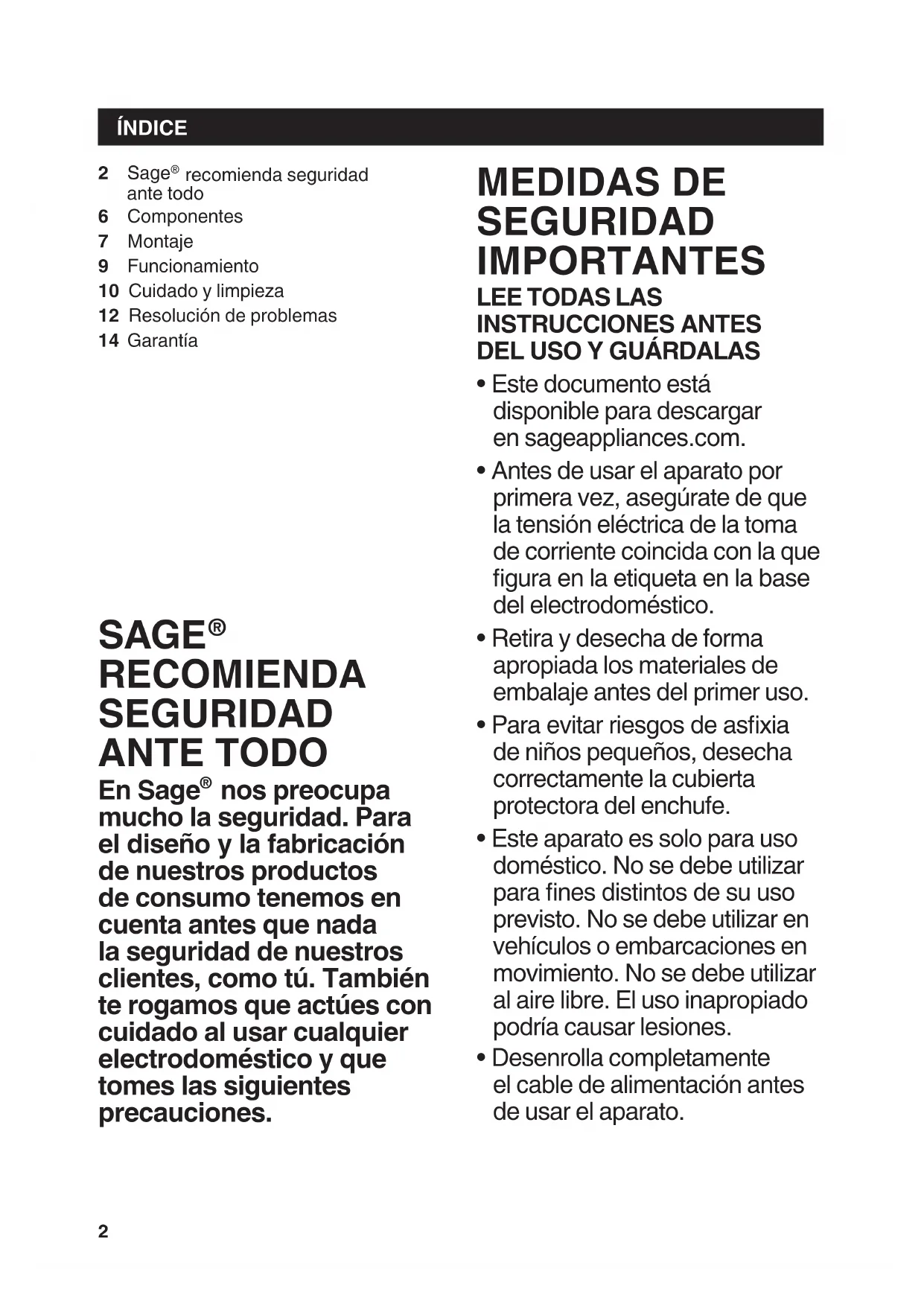 - Desenrolla completamente el cable de alimentación antes de usar el aparato. 2 Sage recomienda seguridad ante todo6 Componentes7 Montaje9 Funcionamiento10 Cuidado y limpieza12 Resolución de problemas14 Garantía3