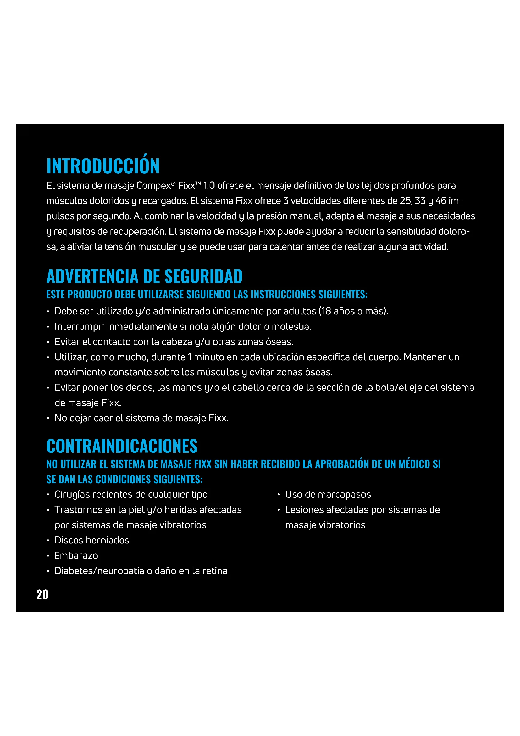 - Lesiones afectadas por sistemas de masaje vibratorios Puede experimentar irritación de la piel y cardenales leves si utiliza el sistema Fixx en un punto durante más de 60 segundos o sobre zonas óseas. Pueden observarse reacciones adversas si se está recuperando de una cirugía, padece algún trastorno de la piel o nervioso, huesos rotos y/o contusiones. Para evitar estas reacciones, los usuarios deben consultar a un médico antes de usar el sistema de masaje Fixx. ADVERTENCIAS PRECAUCIONES REACCIONES ADVERSAS22