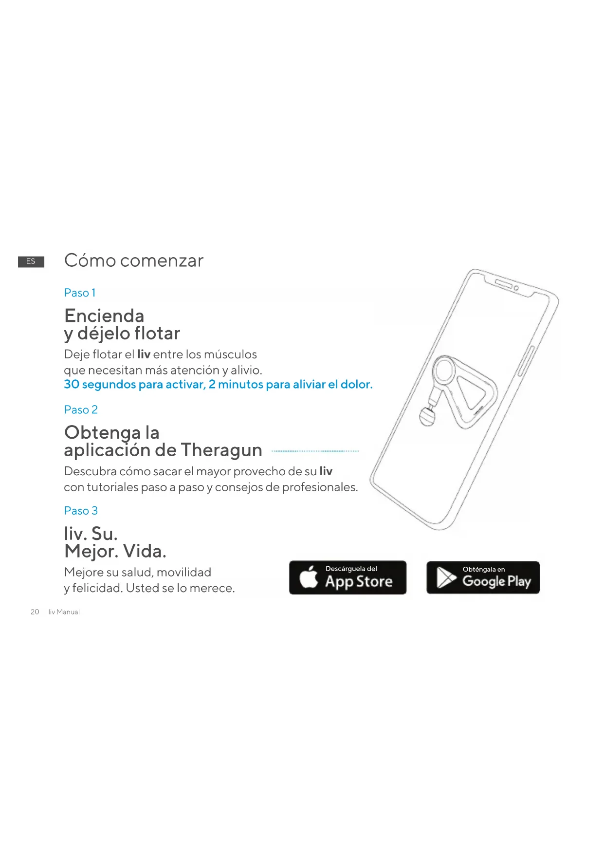 Paso 2 Obtenga la aplicación de Theragun Descubra cómo sacar el mayor provecho de su liv con tutoriales paso a paso y consejos de profesionales. Paso 3 liv. Su. Mejor. Vida. Mejore su salud, movilidad y felicidad. Usted se lo merece. Cómo comenzar Paso 1 Encienda y déjelo flotar Deje flotar el liv entre los músculos que necesitan más atención y alivio. 30 segundos para activar, 2 minutos para aliviar el dolor. Obténgala en Descárguela delliv Manual 21